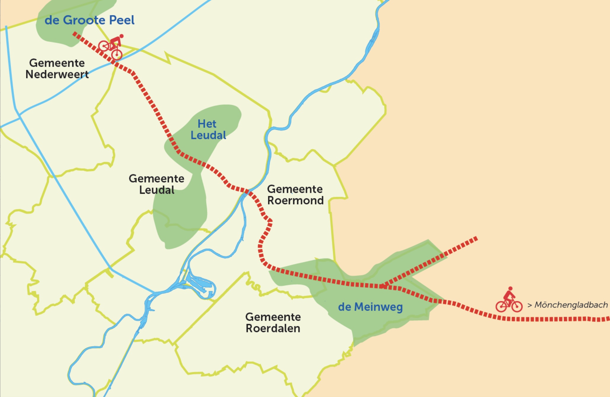 Vandaag is de realisering van de hoogwaardige fietsverbinding van Nationaal Park De Groote Peel naar Nationaal Park De Meinweg een belangrijke stap dichterbij gekomen. In een digitale bijeenkomst en ceremonie ondertekenden wethouders van de gemeenten Nederweert, Leudal, Roermond en Roerdalen en Limburgs gedeputeerde Maarten van Gaans-Gijbels een intentieverklaring voor het gezamenlijk uitvoeren van een verkennende tracéstudie.