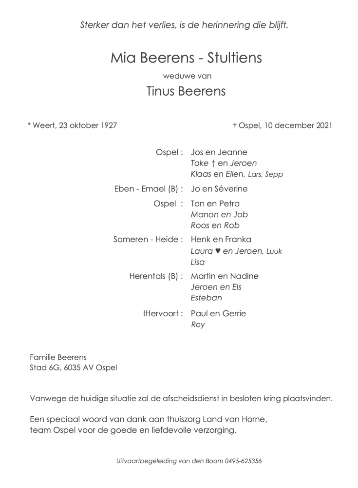 Onze oprechte deelneming met het overlijden van mevr. Mia Beerens-Stultiens.