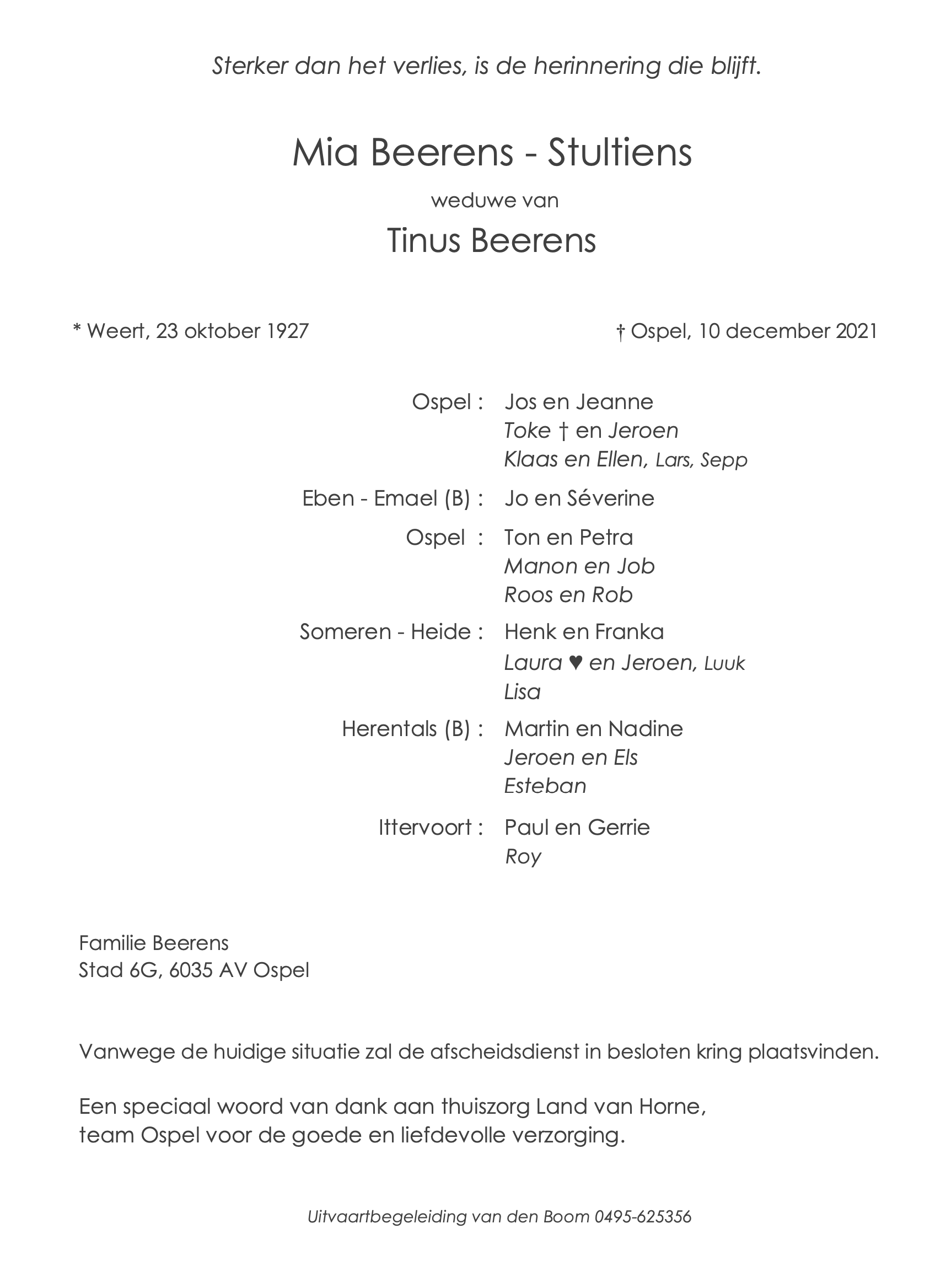 Overlijdensbericht: Mia Beerens – Stultiens †