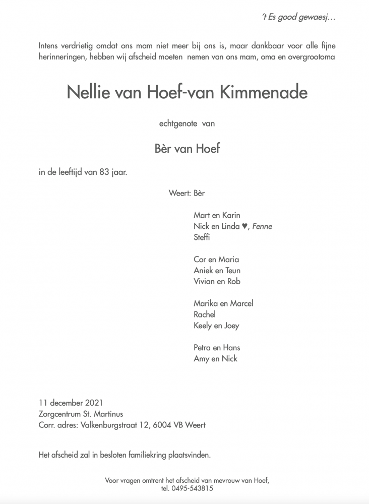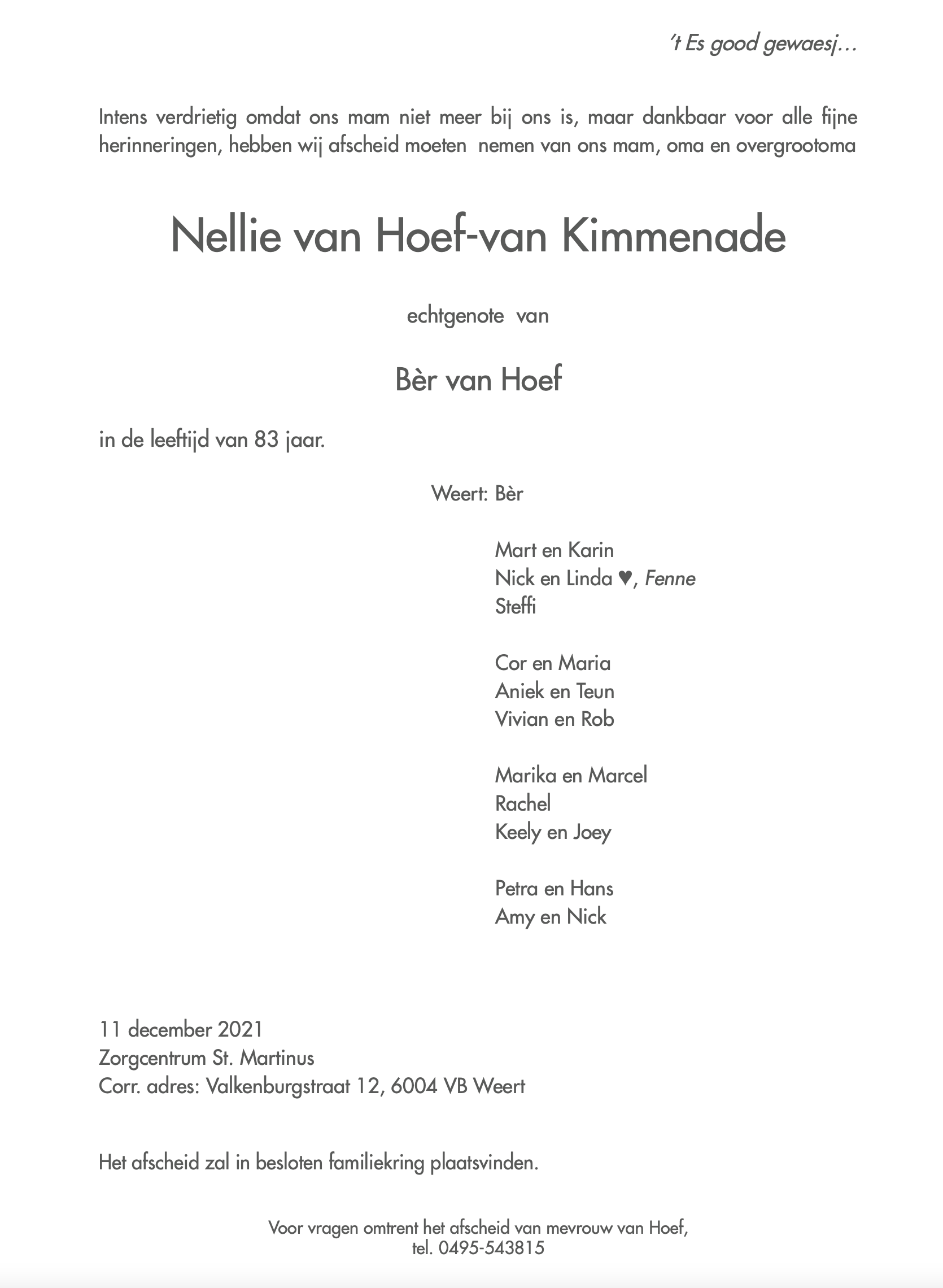 Overlijdensbericht: Nellie van Hoef-van Kimmenade †