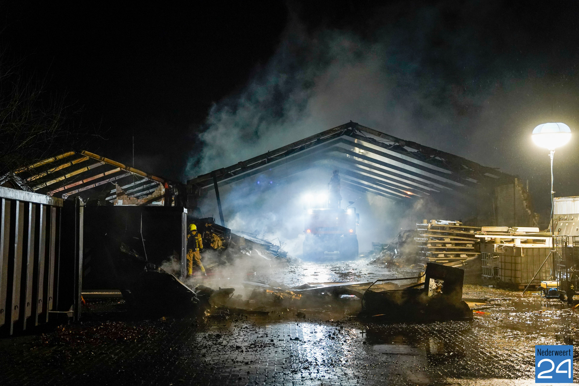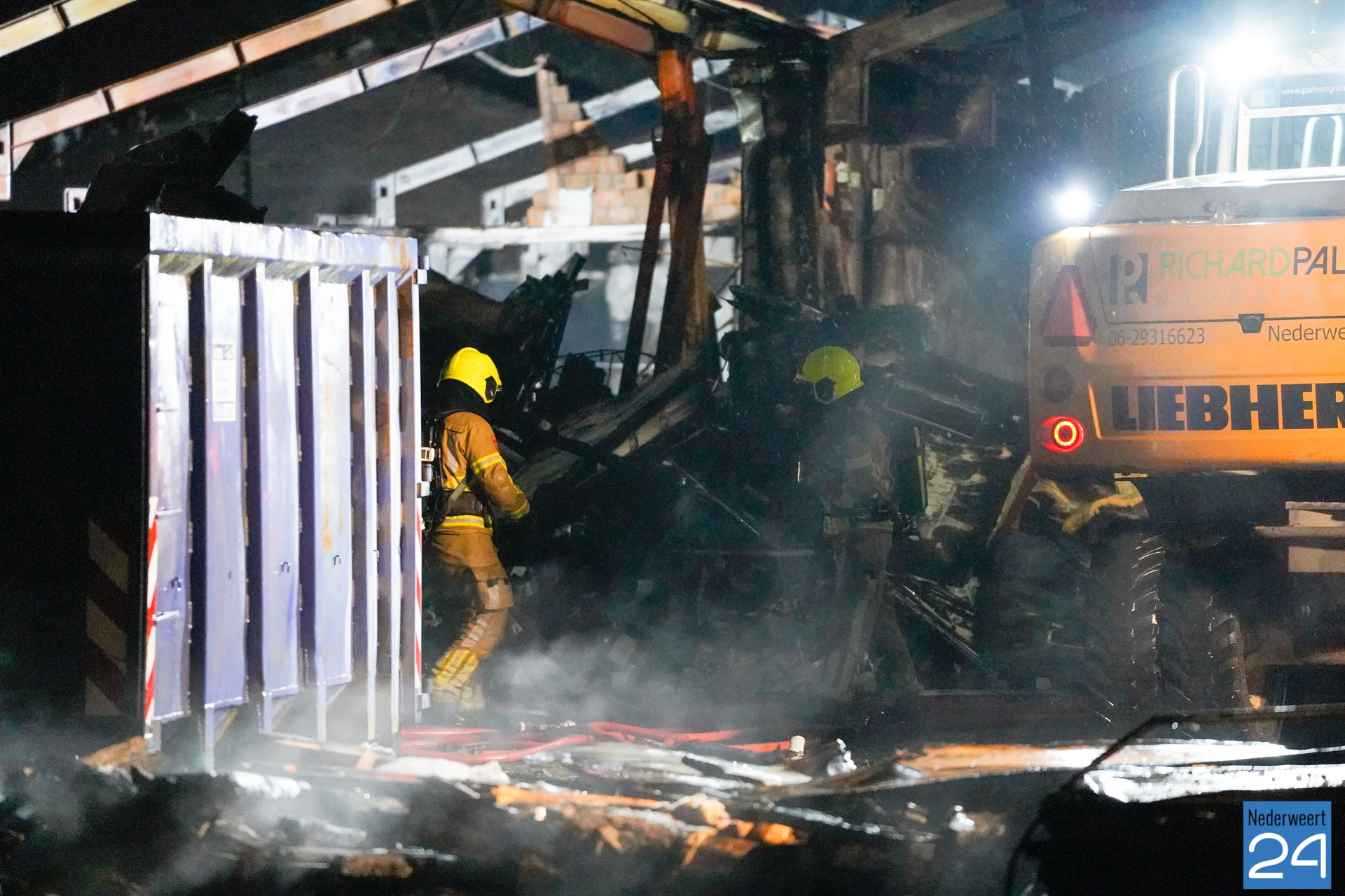 Woensdagavond was de brandweer nog druk in de weer om het vuur te blussen. Met een kraan werden brandende delen van het gebouw gehaald en op de grond afgeblust.