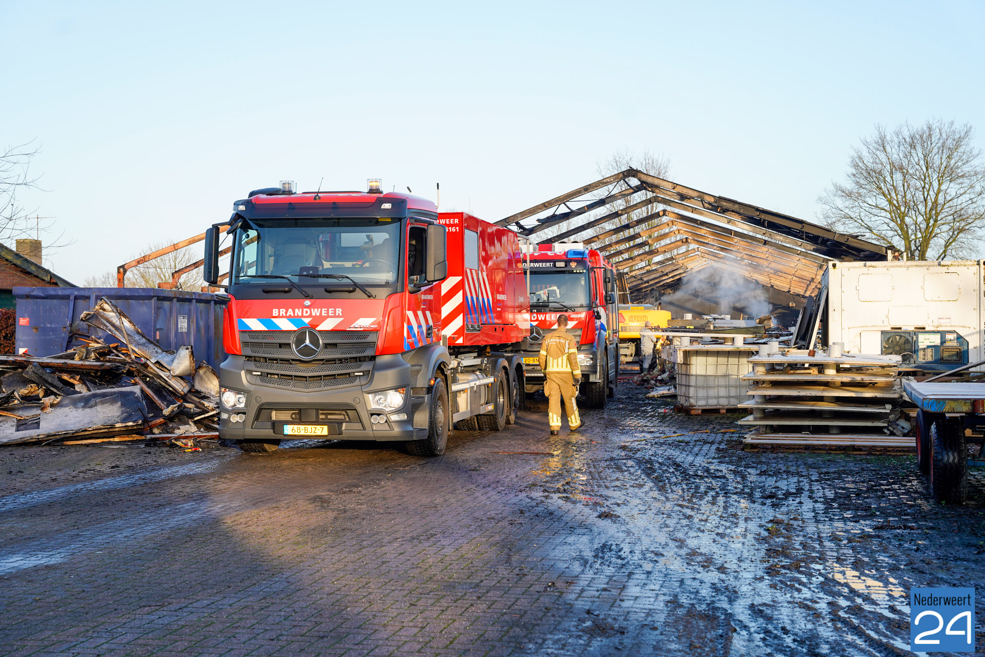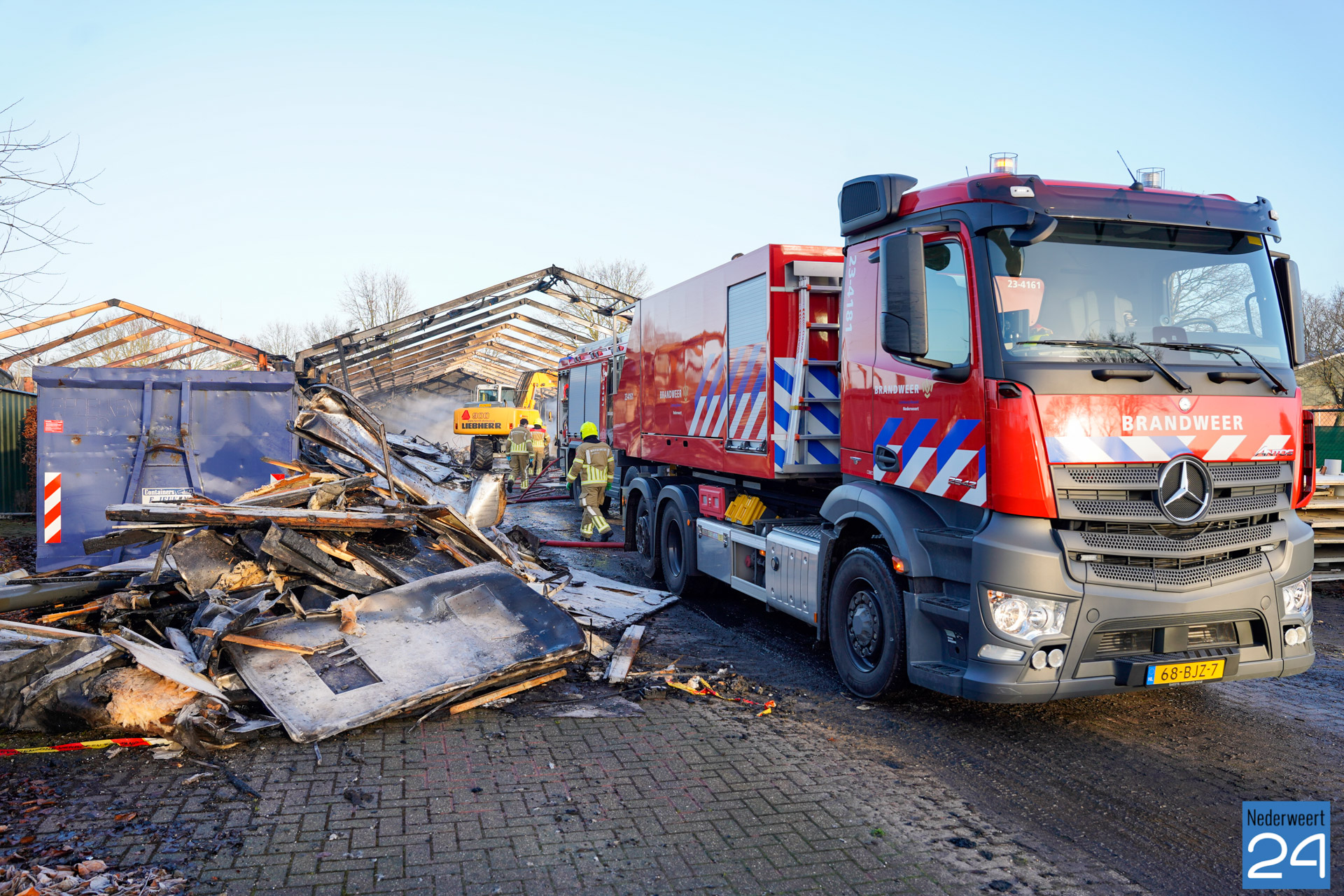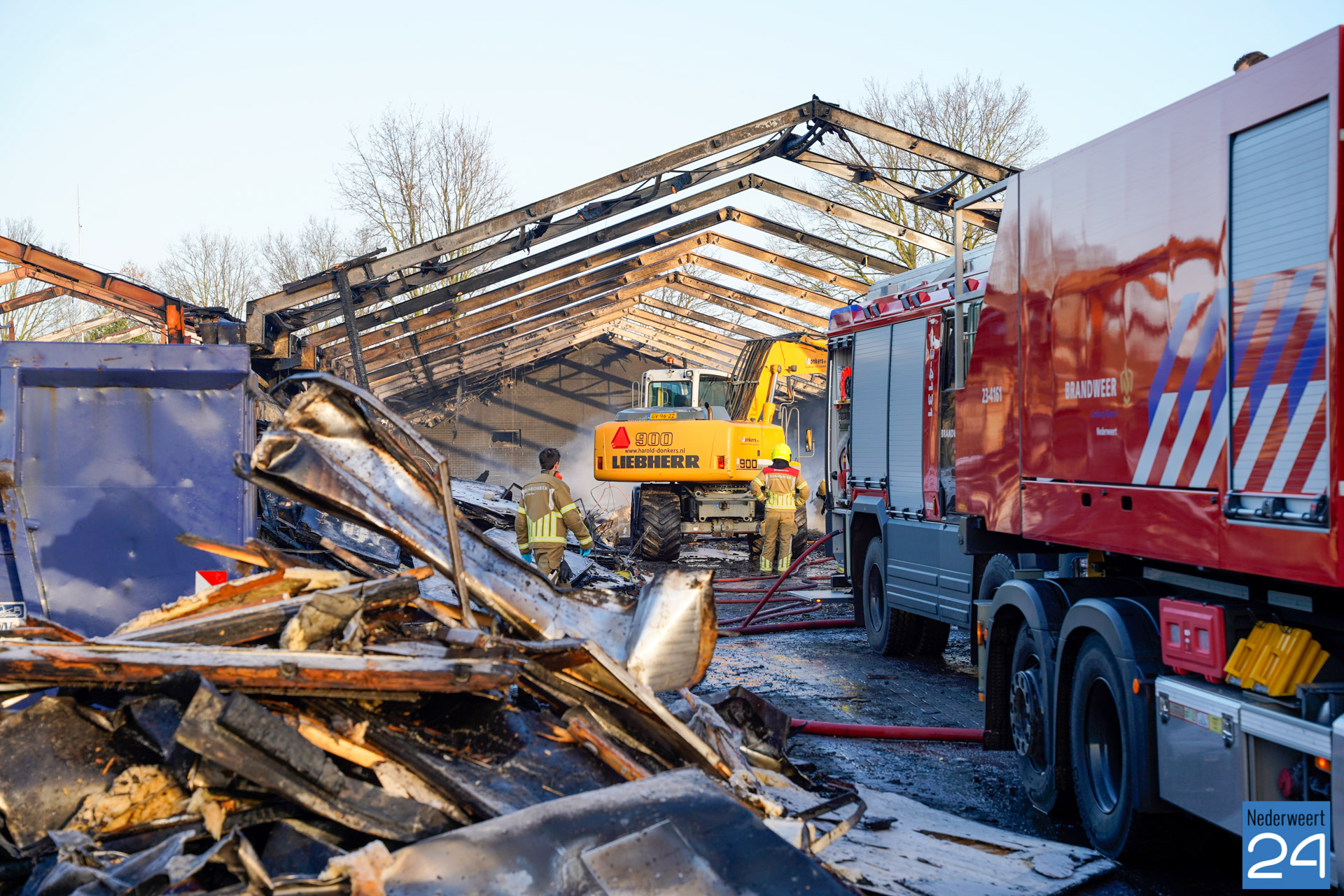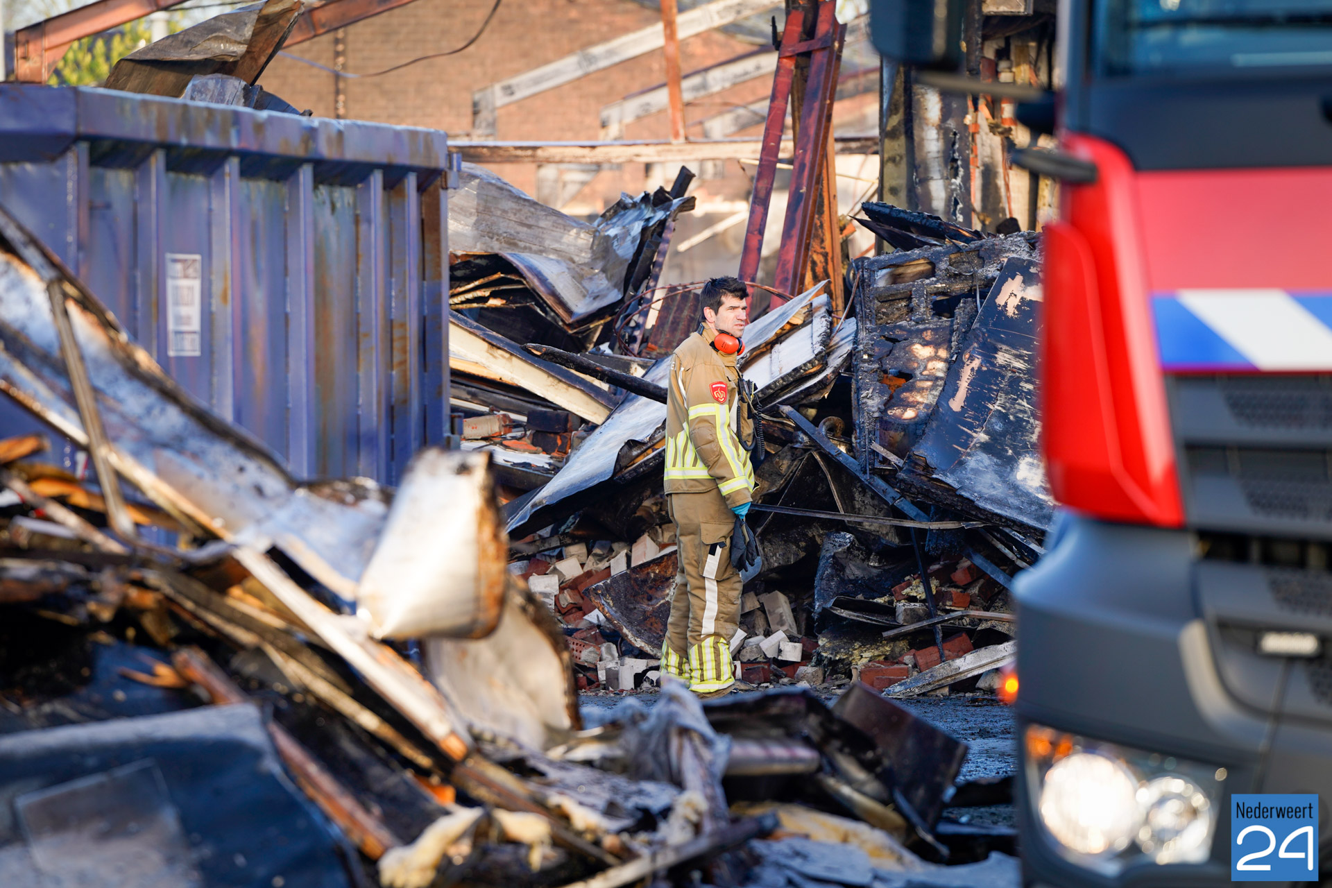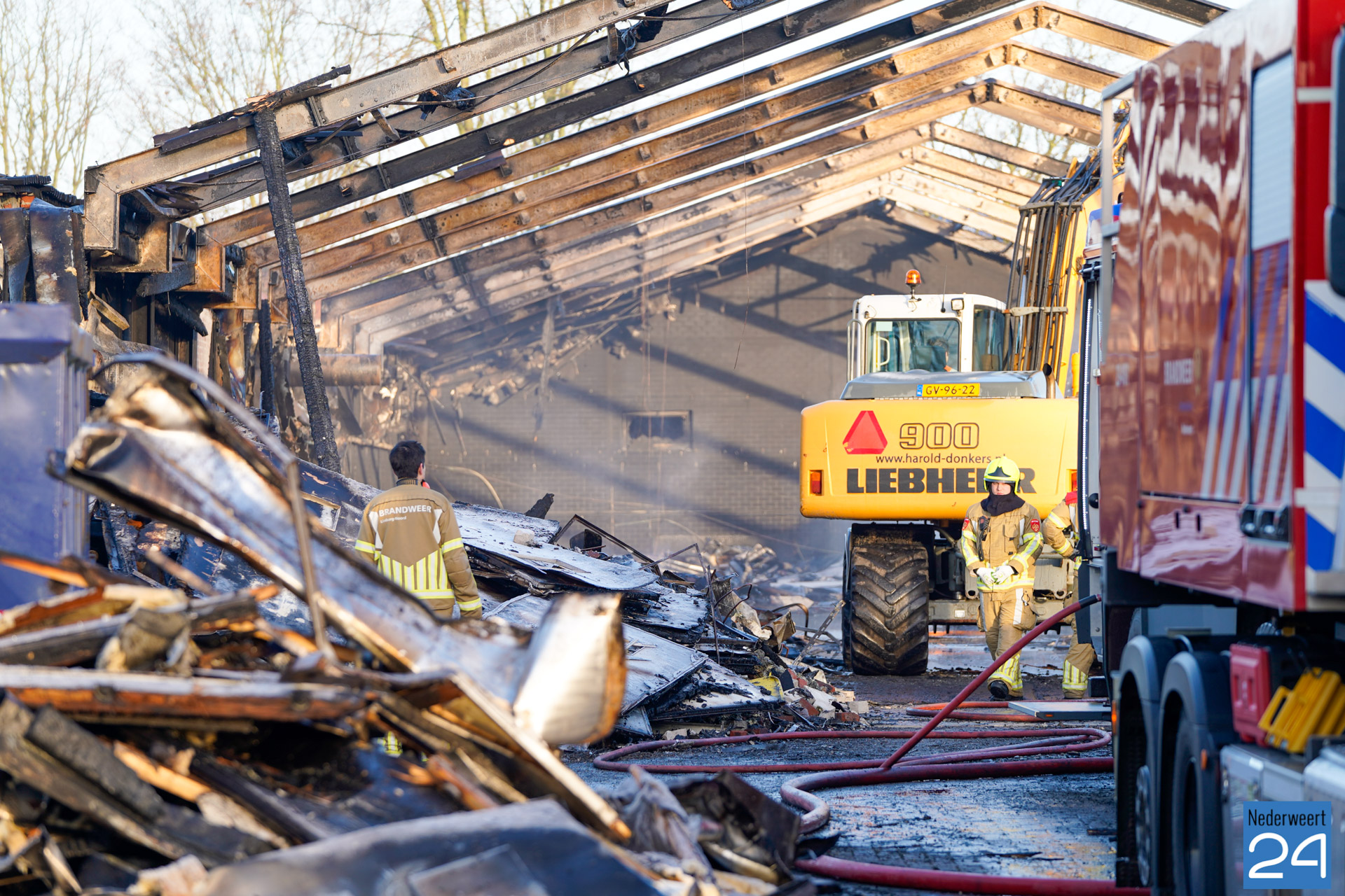 Nadat de brandweer woensdagavond tot middennacht aanwezig is geweest voor het blussen van de brand in het voormalig agrarisch bedrijf aan de Bloemerstraat, werden de vrijwilligers van post Nederweert donderdagochtend rond negen uur opnieuw gealarmeerd. Tussen het puin waren op diverse plekken weer brandjes ontstaan. Met een waterwagen, een blusvoertuig en een kraan werd opnieuw begonnen met nablussen.