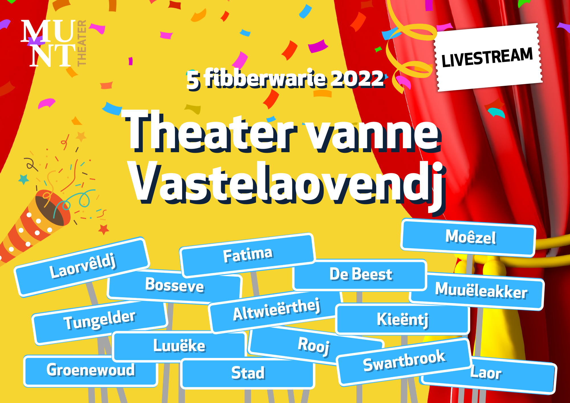 Wie dacht dat het Vastelaovendj seizoen stilletjes voorbij zou gaan, heeft buiten het Munttheater gerekend! Hoewel het traditionele programma in het theater door de huidige covid-19 maatregelen niet door kan gaan, kijkt het Munttheater naar wat wél kan. Zaterdag 5 februari a.s. verandert het dan ook eenmalig haar naam in het Plezeer Peliês, Theater vanne Vastelaovendj! Als opwarmertje voor de Wieërter Vastelaovendj organiseert het theater een digitale marathonuitzending, die via de website munttheater.nl te volgen is en die volledig in het teken staat van gekkigheid en plezier.