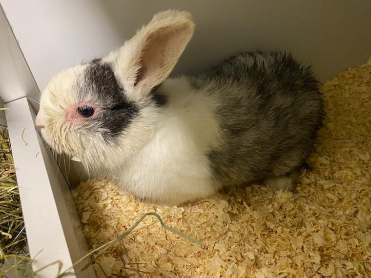 Het konijn was vies, had ontstoken ogen en was zeer schichtig. Vrijwilligers van de dierenambulance gaven het konijntje een lekkere bak voer en met de juiste medicatie is het momenteel tot rust aan het komen in quarantaine.