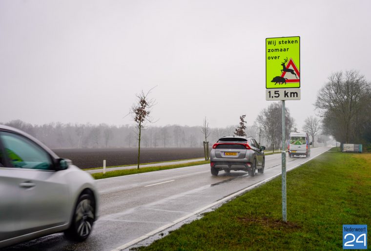 Sinds dinsdag staan er langs de weg aan de Houtsberg tussen Nederweert-Eind en Leveroy aan beide kanten van de weg waarschuwingsborden met de tekst “wij steken zomaar over”