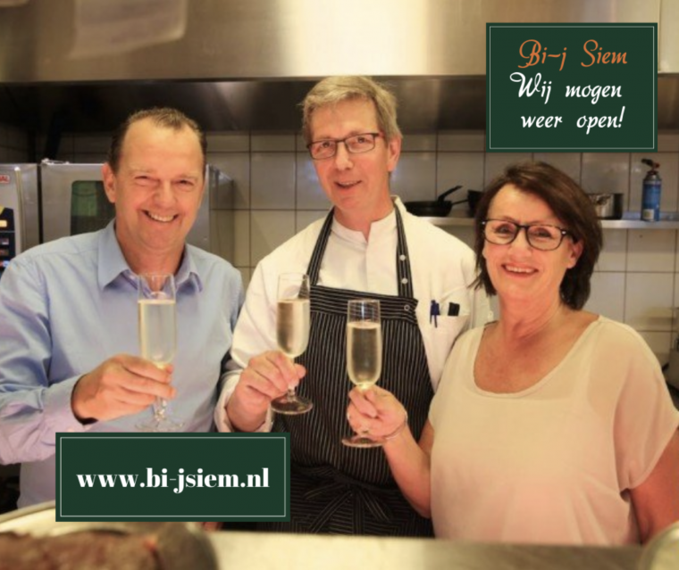 Naast het positieve nieuws was er ook de waarschuwing voor de sterk oplopende aantallen besmettingen. Voorzichtigheid blijft geboden! ‘‘Dus wij begrijpen dat een bezoek aan de horeca, in zijn algemeen, nog niet voor iedereen is weggelegd. Daarom zullen wij voor iedereen ons aanbod ‘Siem Thuis’ actueel houden. Op basis van de nieuwe winterkaart kunt u ‘restaurantklare’ gerechten bestellen. Op porselein bereid en warm aangeleverd in speciale boxen. Of u kiest uit ons uitgebreide assortiment Bi-j Siem Winkelproducten. ‘Saame’ uit eten, maar dan thuis…veilig en vertrouwd! Wilt u iemand met iets speciaaals verrassen, dan hebben wij voor u onze relatiegeschenken/cadeaupakketten of de Bi-j Siem cadeaubonnen.”
