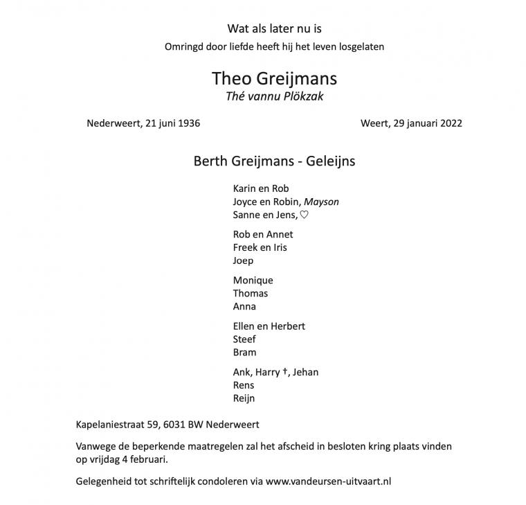 Beste familie Greijmans wij wensen jullie heel veel sterkte met het verlies van jullie dierbare Theo