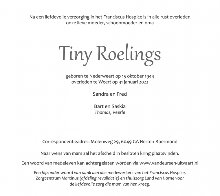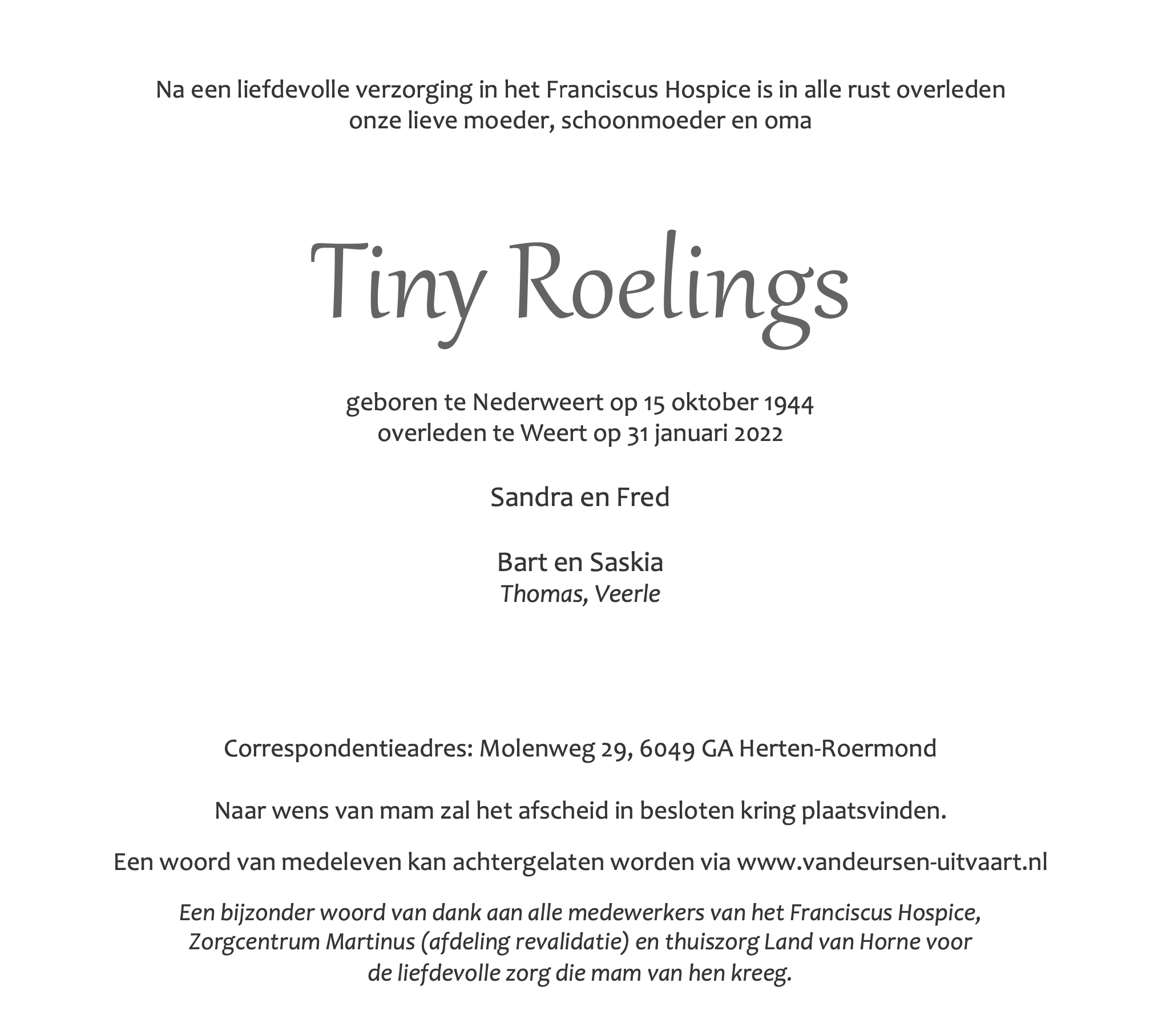 Gecondoleerd allemaal voor het overlijden van jullie lieve mam schoonmoeder oma Tiny !Heel veel sterkte samen gewenst voor de komende periode!