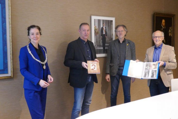V.l.n.r. locoburgemeester Wendy van Eijk, gemeentearchivaris Jacq Lemmen, Peter Frenken en Koos Neijnens