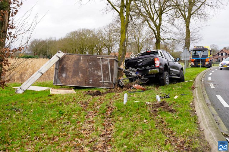 Een pick-up met aanhangwagen is vrijdagmorgen gecrasht op de Astenseweg in Meijel. Hierbij raakte niemand gewond.
