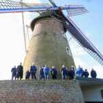 De trotse molenaars poseerden samen met wethouder Stienen (3e van links) de nieuwe kleding bij de Sint Joseph molen