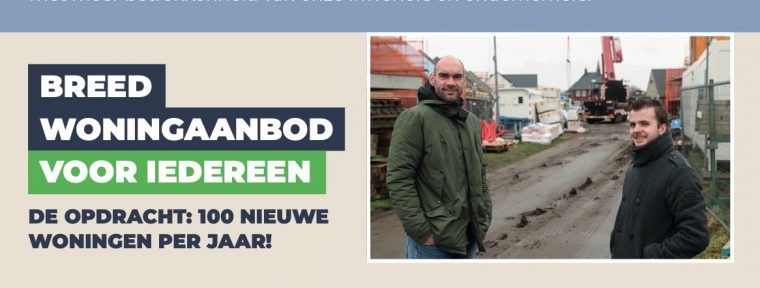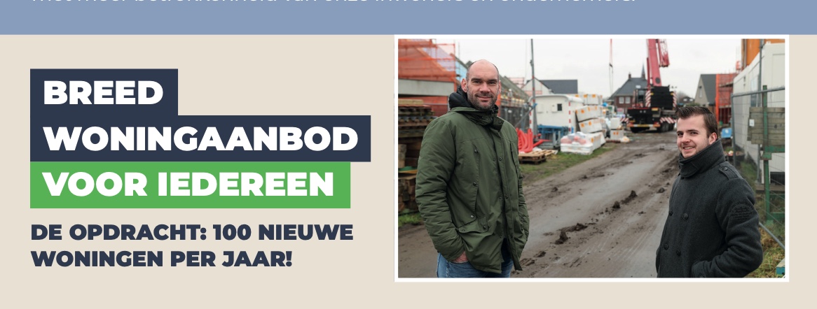 De komende raadsperiode 100 woningen per jaar erbij, verdeeld over de kernen. De gemeente zorgt voor de bestemming en vergunning. Onze inwoners bepalen welk type huizen er nodig zijn.”