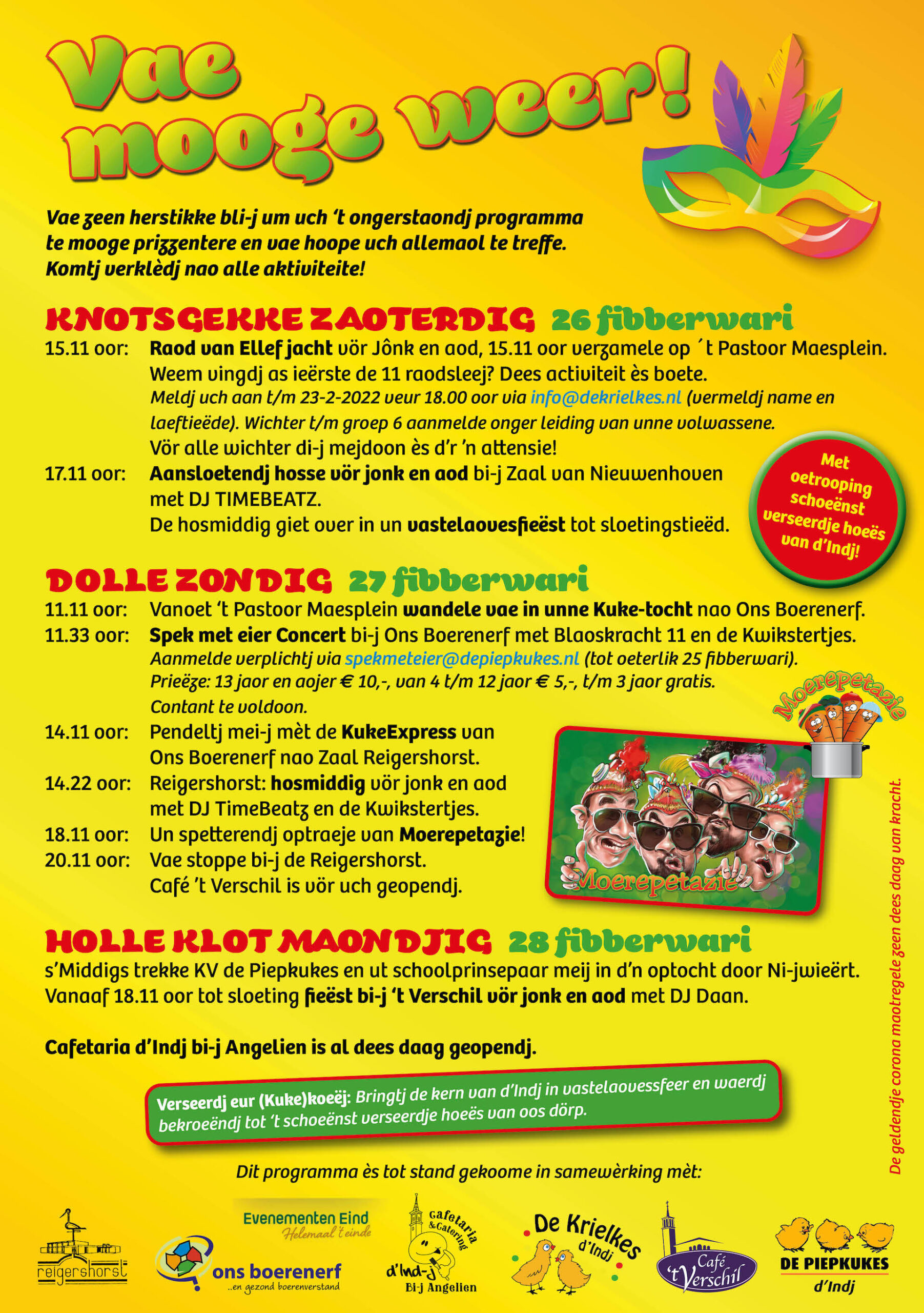 We mogen weer! Daarom hebben K.V.De Piepkukes en J.K.V. de Krielkes in samenwerking met de lokale horeca een gevarieerd programma samengesteld voor jong en oud.