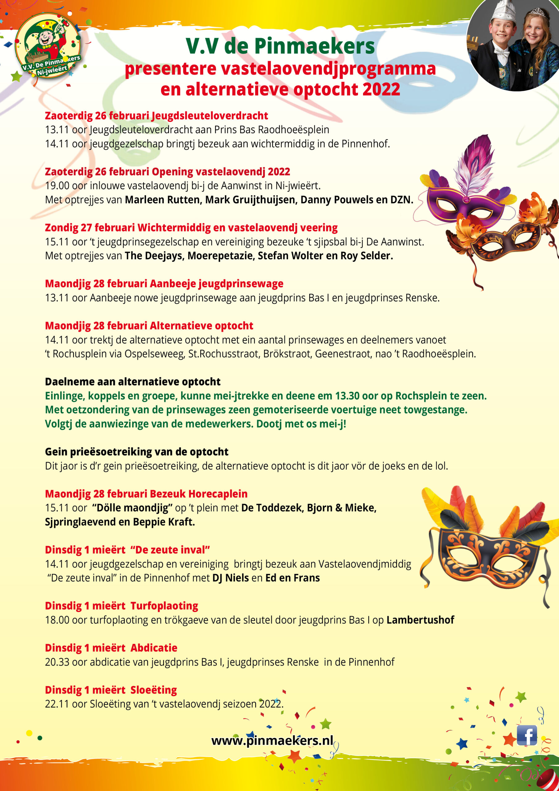Het zag er lange tijd naar uit dat er niet veel vastelaovendj gevierd zou worden. ’t virus is de vastelaovendjvierders inmiddels beter gezind. Alle reden voor vastelaovendj vereiniging De Pinmaekers toch een programma en alternatieve optocht te presenteren voor 2022.