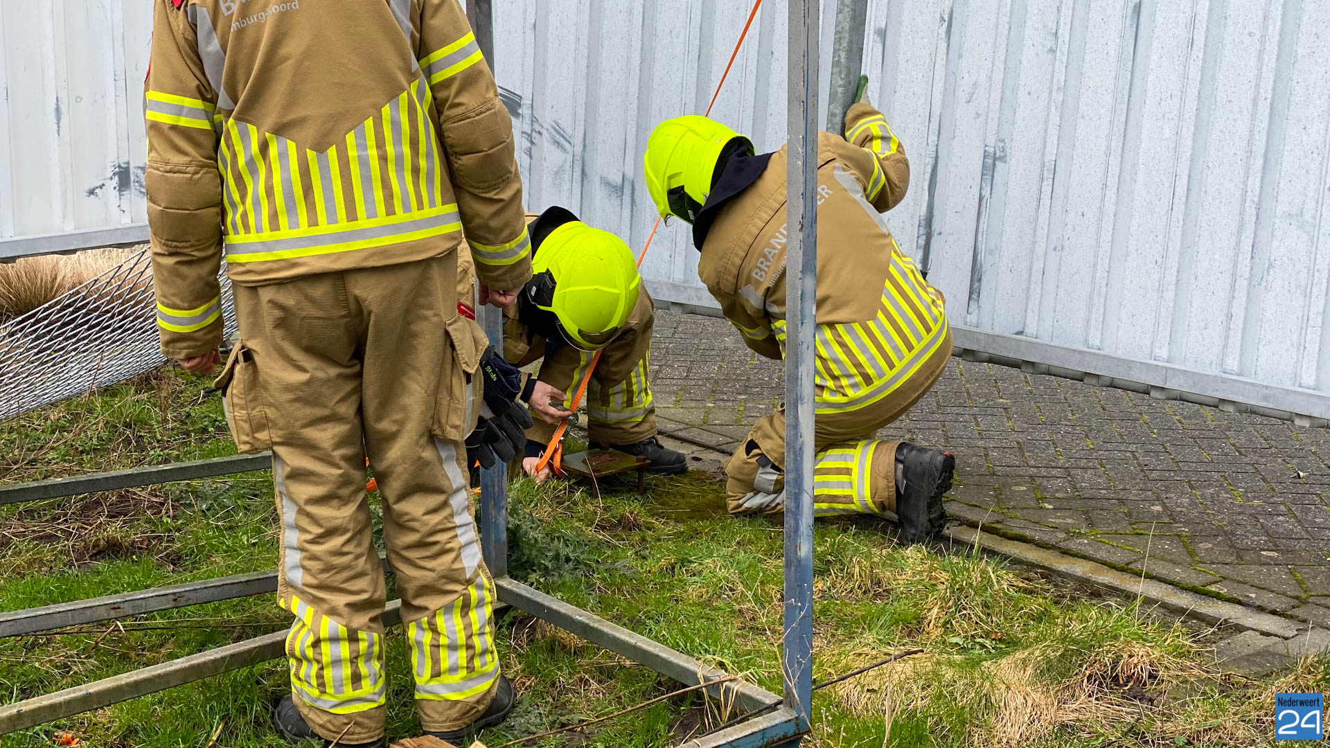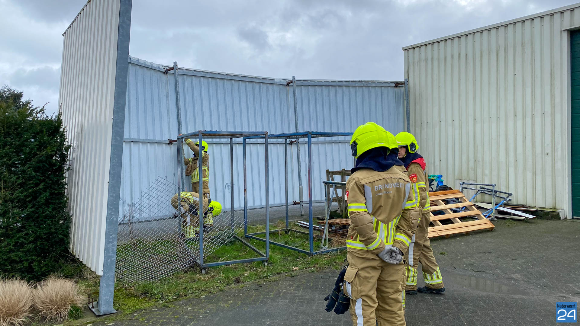 De brandweer heeft met een spanband de wand weer vast gezet. De eigenaar van het bedrijf moet maandag zorgen dat de wand weer helemaal vast gezet wordt.
