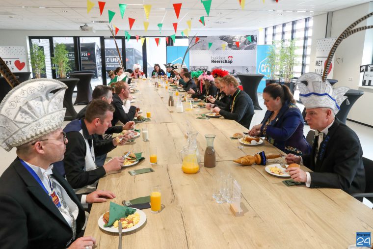 Zaterdagochtend waren de jeugdprinsenparen van De Pinmaekers en de Vlikkestaekers met hun gevolg en de afgevaardigden van De Bengels en De Piepkukes aanwezig tijdens het jaarlijkse Vastelaoves-ontbijt bij Bakkerij Heerschap. De verenigingen ontvingen allemaal een cheque van €111,11 uit handen van eigenaar Stan Heerschap.