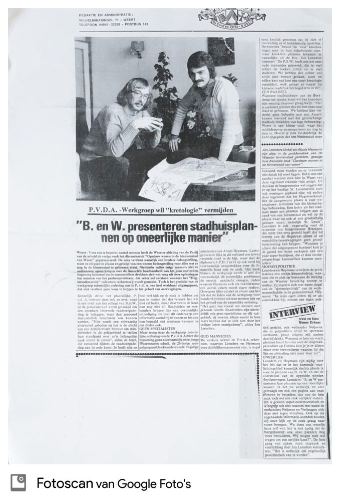 Begin jaren ’70 bogen de twee, toen jonge, PvdA-ers zich over de bouw van een stadhuis op de plek van het onderwijsinstituut St. Louis. Ze kwamen met, door de TU Eindhoven onderbouwde, plannen voor nieuwbouw áchter de bestaande gevel aan de Korenmarkt-Schoolstraat. In het plan van de toenmalige PvdA zou er in het Hegstraat-kwartier plaats zijn voor woningbouw. Immers, betaalbaar wonen in de binnenstad stond ook tóen hoog op de wensenlijst van PvdA Weert (zie kopie voorpagina weekblad ‘Land van Weert’ uit 1972). Na de Tweede Wereldoorlog werd een deel van de historische binnenstad afgebroken om Weert op te stoten in de vaart der volkeren. Als antwoord daarop kwam toentertijd de Weerter PvdA met het idee om hier weer stadswoningen te realiseren.
