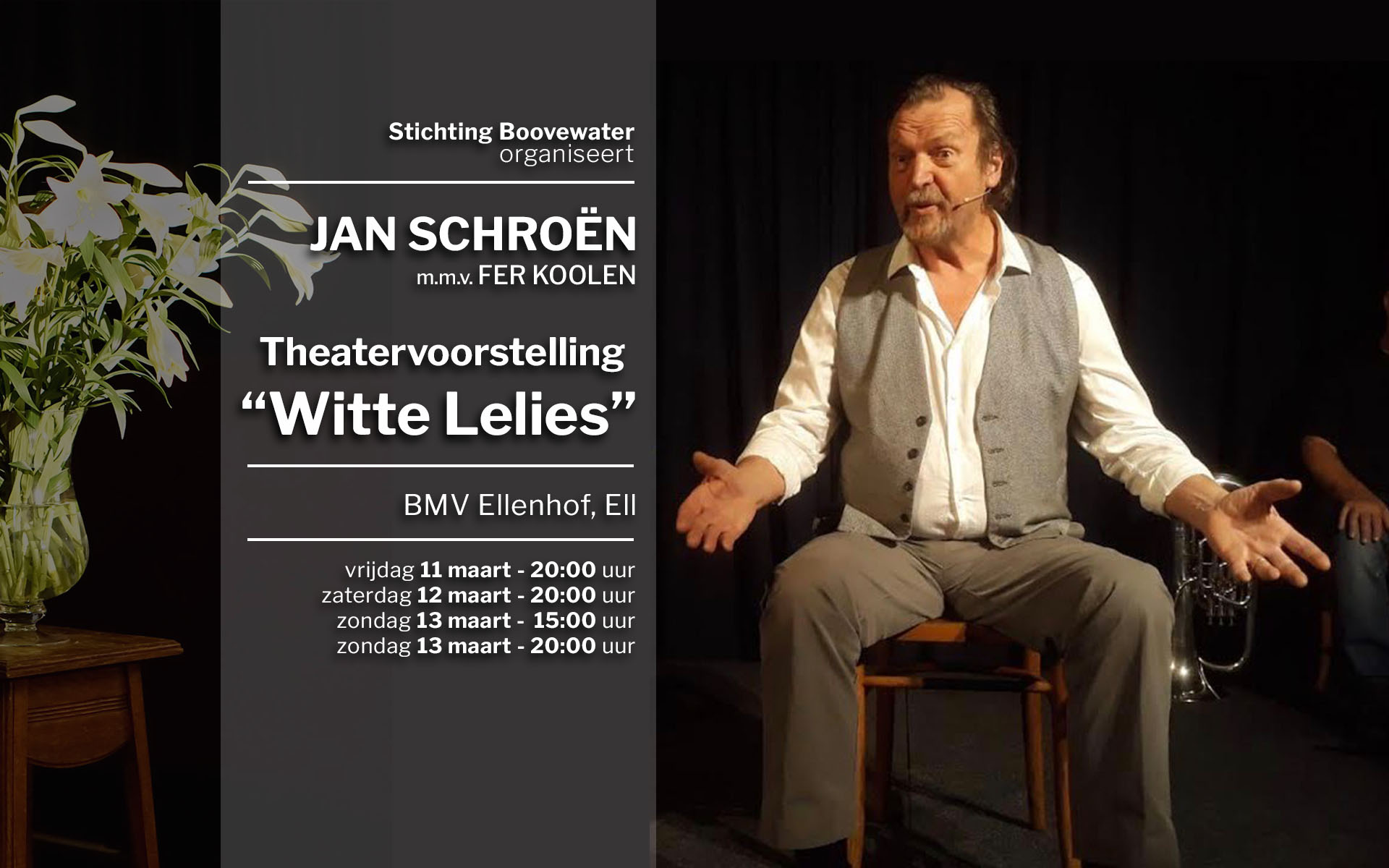 Voorstellingen van ‘Witte Lelies’ in BMV Ellenhof te Ell is van Jan Schroën m.m.v. Fer Koolen