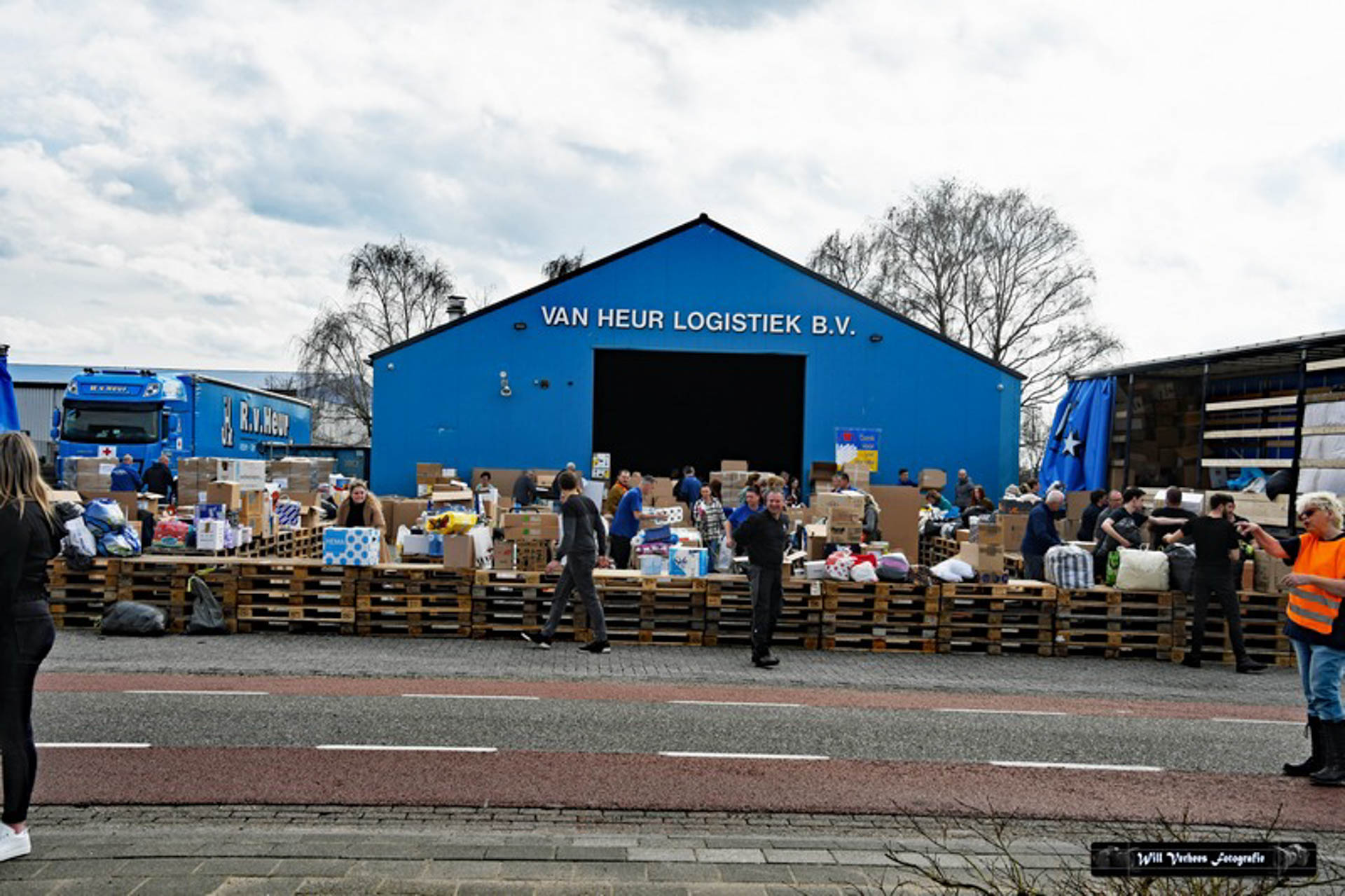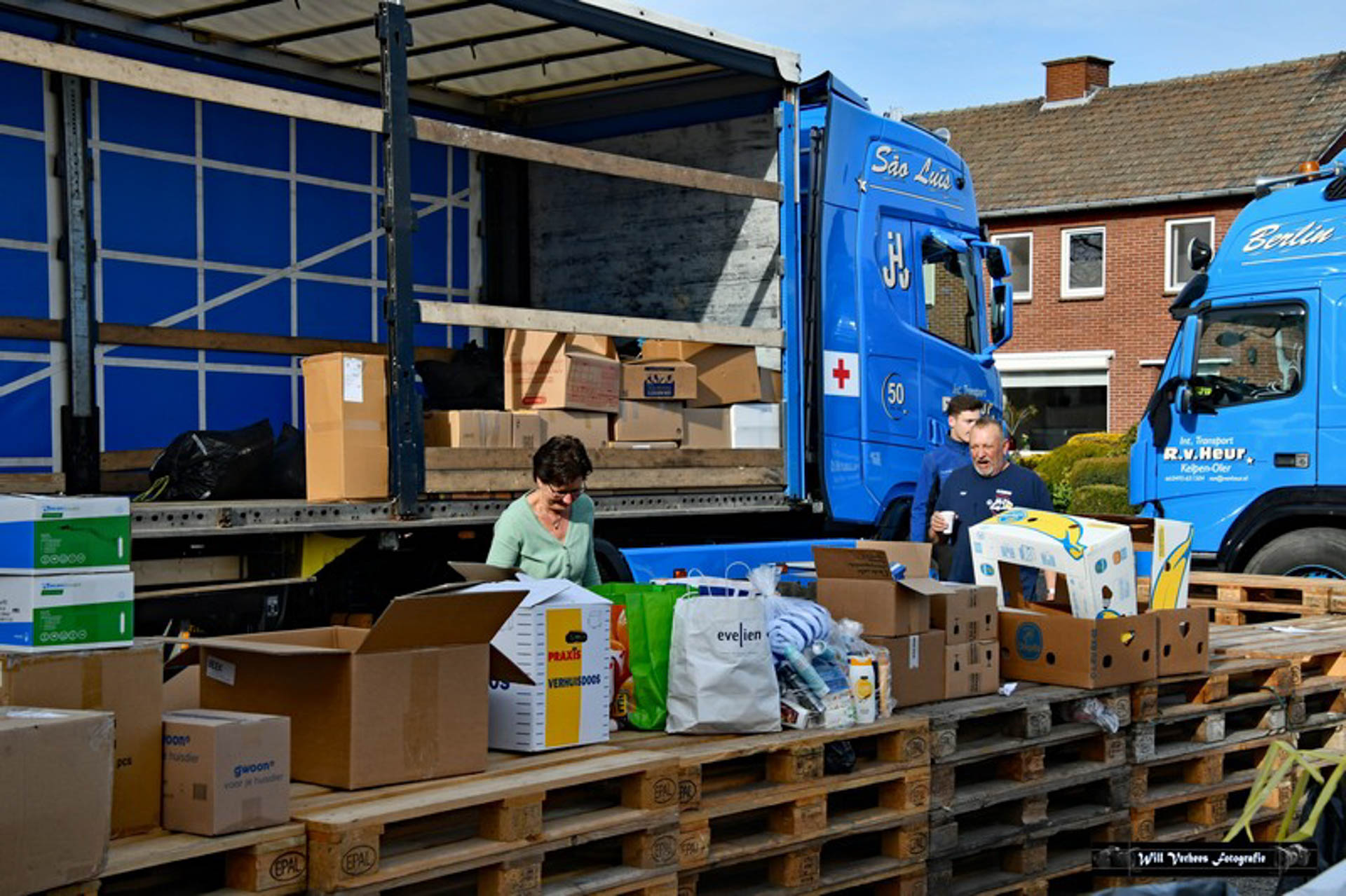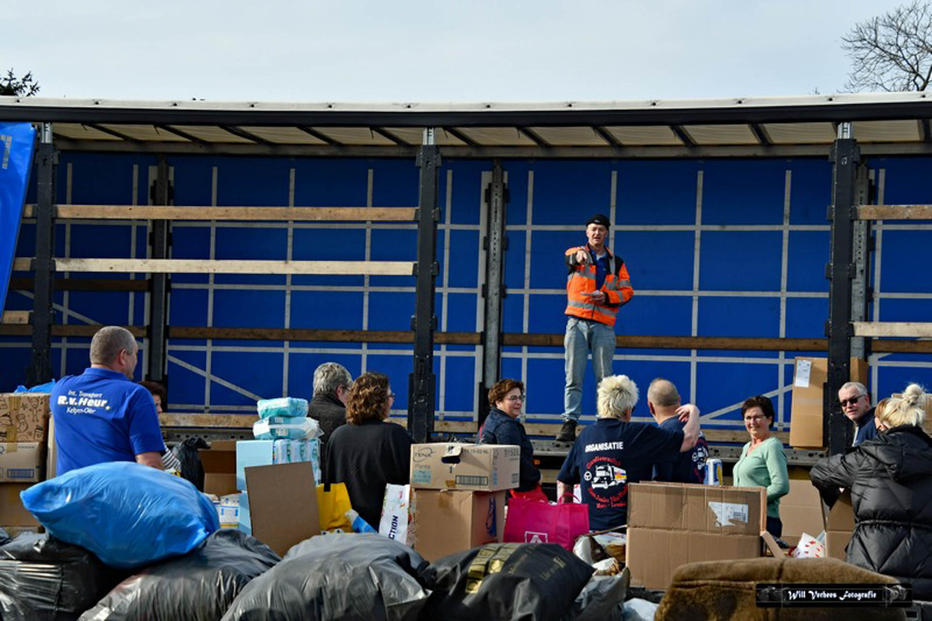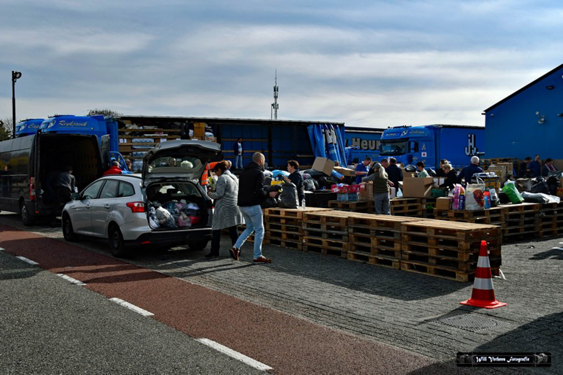 Vanwege de drukte werden verkeersregelaars ingezet en vele vrijwilligers waren opgetrommeld om een en ander in goede banen te leiden. Bedoeling was in eerste instantie om drie vrachtwagens van het transportbedrijf met spullen naar de grens van Polen met Oekraïne te sturen. Maar al snel werd dat bijgesteld naar vijf.