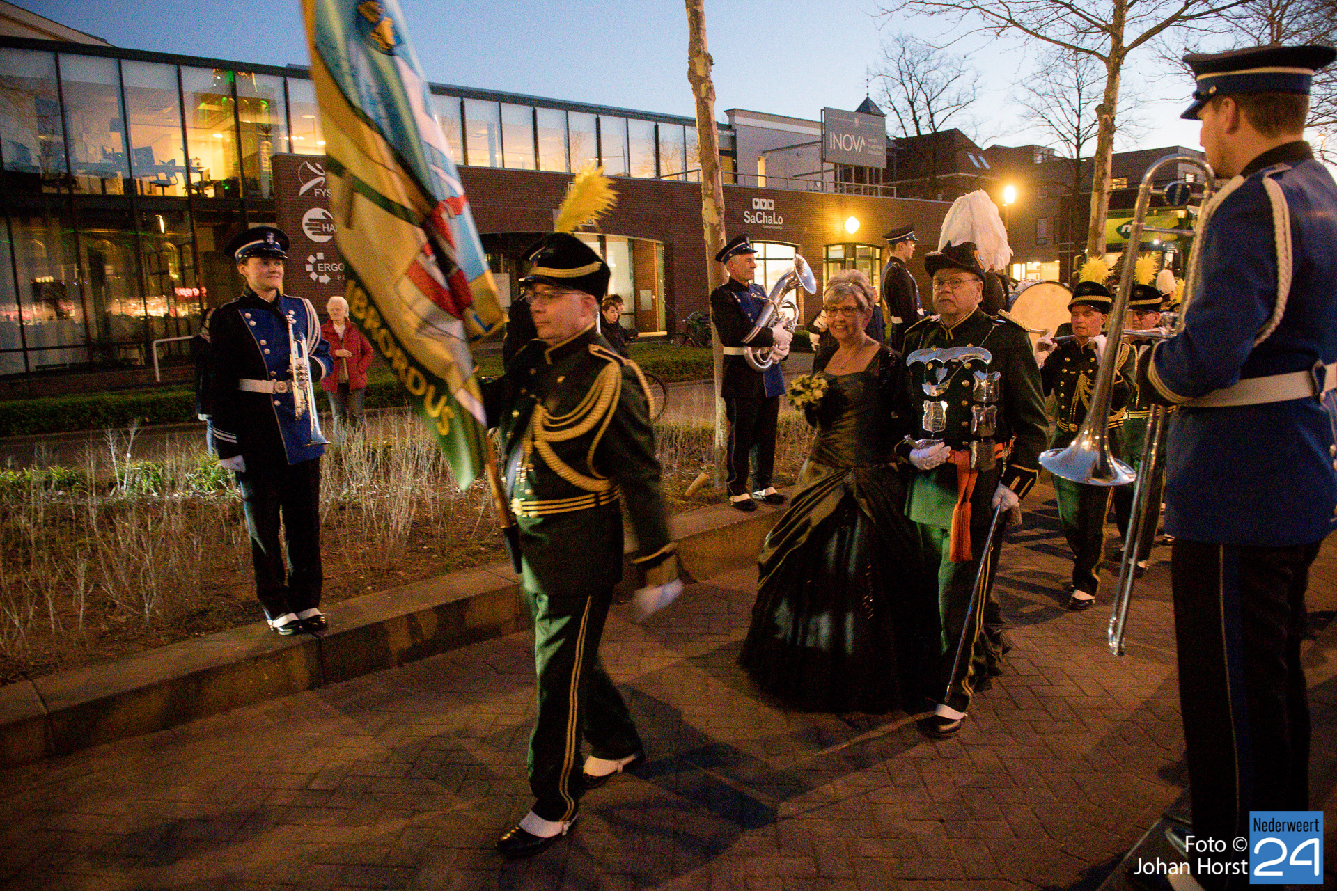 De avond begon met een optocht vanuit de parkeerplaats van de Aldi naar het gemeenschapshuis. Het winnende zestal stond op een open vrachtwagen. Voorop liepen de leden van St. Willibrordus. Aangekomen bij D’n Binger werden zij opgewacht door schutterij St. Nicolaas.