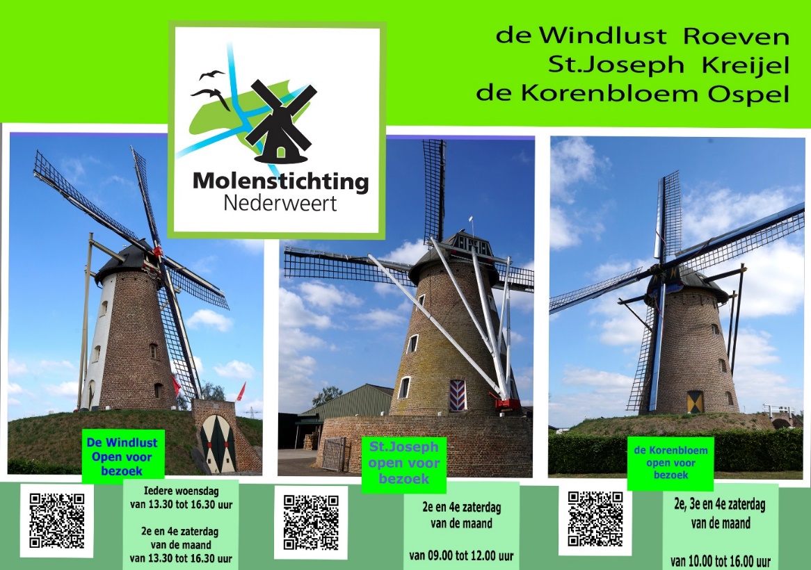 Ook de drie molens van Molenstichting Nederweert doen hieraan mee. Om 10.59 uur werd de vang losgetrokken om zodoende de molen te laten draaien. Op de Korenbloem molen in Ospel was er een muzikale bijdrage door Harmonie Melodie der Peel Ospel en Harmonie St Joseph Nederweert. Wethouders Dieteren en Stienen waren hierbij aanwezig. Wethouder Stienen bracht vervolgens ook een bezoek aan de St. Joseph Molen op Kreijel.