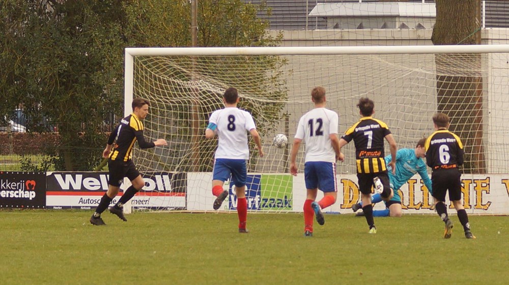 Halverwege de eerste helft wisten de rood-wit-blauwen het duel open te breken; een loeihard schot van spits Luke Thissen leidde tot een mooie treffer. Hoewel de kansen schaars bleven, liet het antwoord van de thuisclub niet lang op zich wachten. Tijdens een aanval van Glenn Versluis over de rechterflank werd back Dylan Wiechmann in het zestienmetergebied omver geduwd, met een strafschop tot gevolg. Ken Boonen wist er wel raad mee en liet doelman Julicher kansloos vanaf de stip: 1-1.