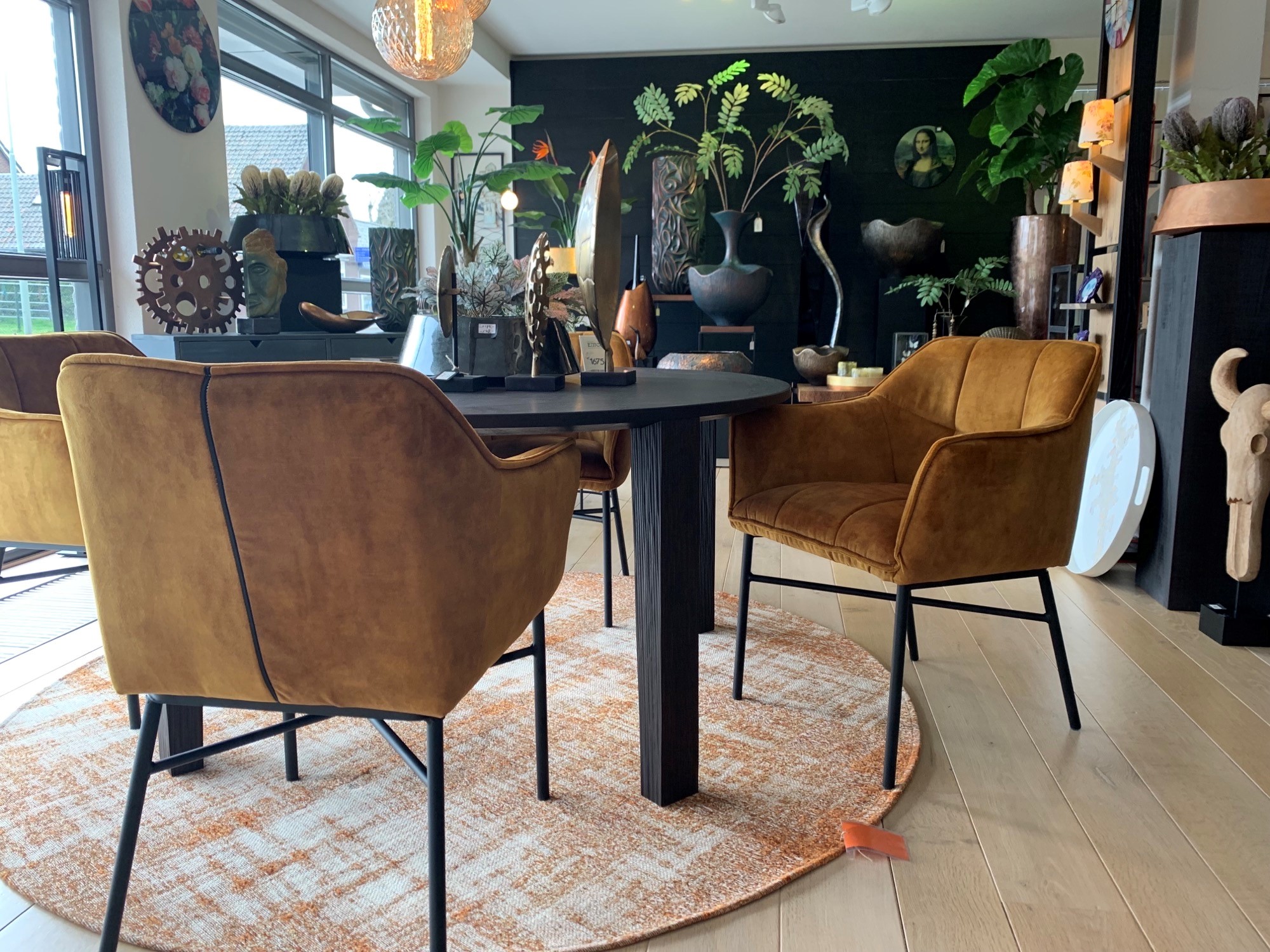 Eetkamerstoel Theodor is een fijne stoel die met velvet bekleed is. Deze stof heeft een zachte look en feel en staat prachtig in een interieur met een luxueuze uitstraling. De luxe uitstraling van deze eetkamerstoel komt niet alleen door de chique stof. Het onderstel is van zwart metaal en is gepoedercoat voor een matte, stoere afwerking. Het zwart gelakte stalen frame vormt een mooi contrast met de velvet stof. De stoel kost € 240.-.