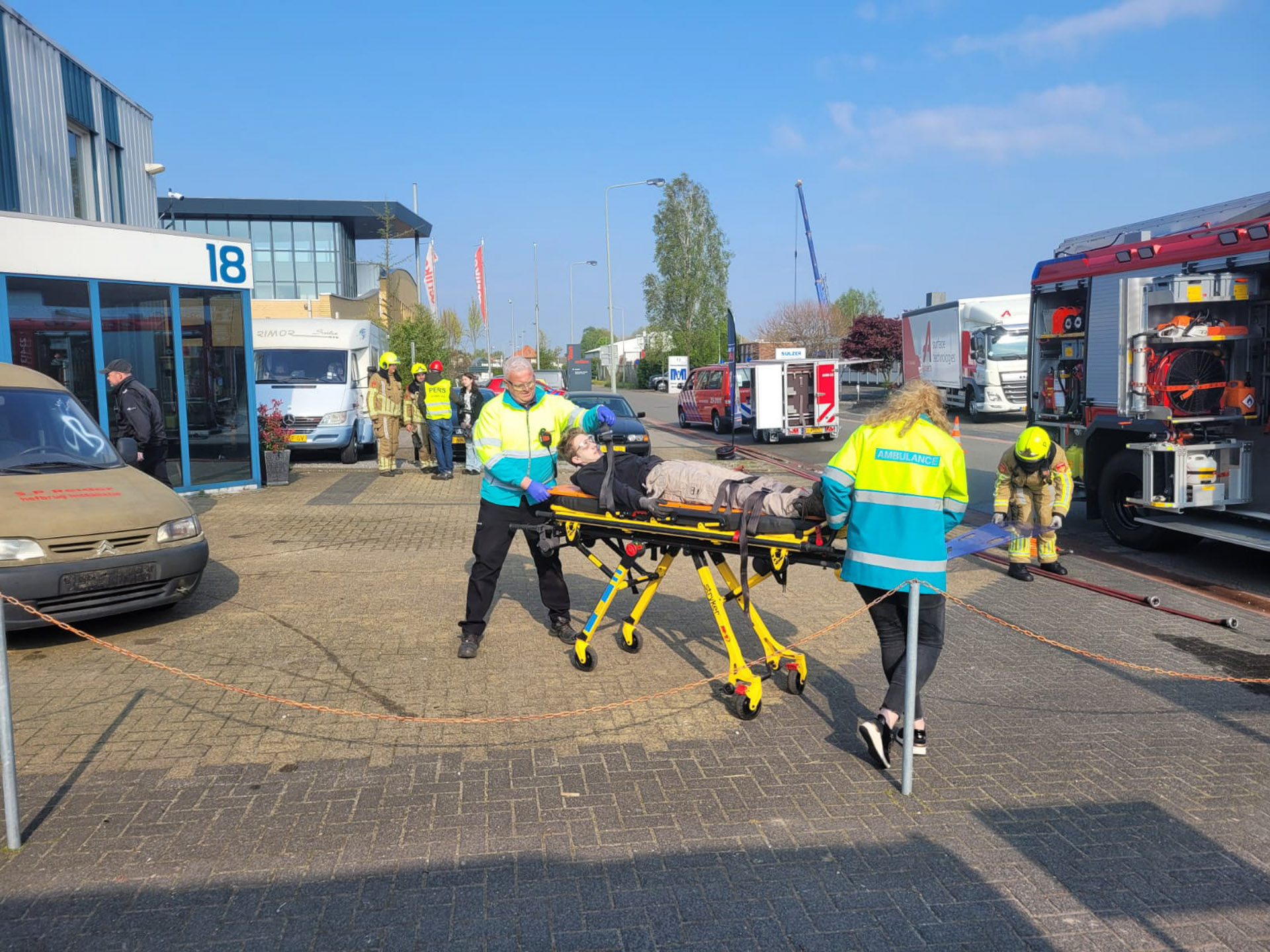 Een persoon zou in een garage bekneld zijn geraakt onder auto. Bij aankomst bleek er in de garage ook een container in brand te staan. De brandweerlieden dienden eerst de brand te blussen. Vervolgens werd de eigenaar van de garage bewusteloos aangetroffen bij een busje. De eigenaar moest gered worden en vervolgens moest ook de persoon die bekneld lag onder de auto bevrijdt worden.