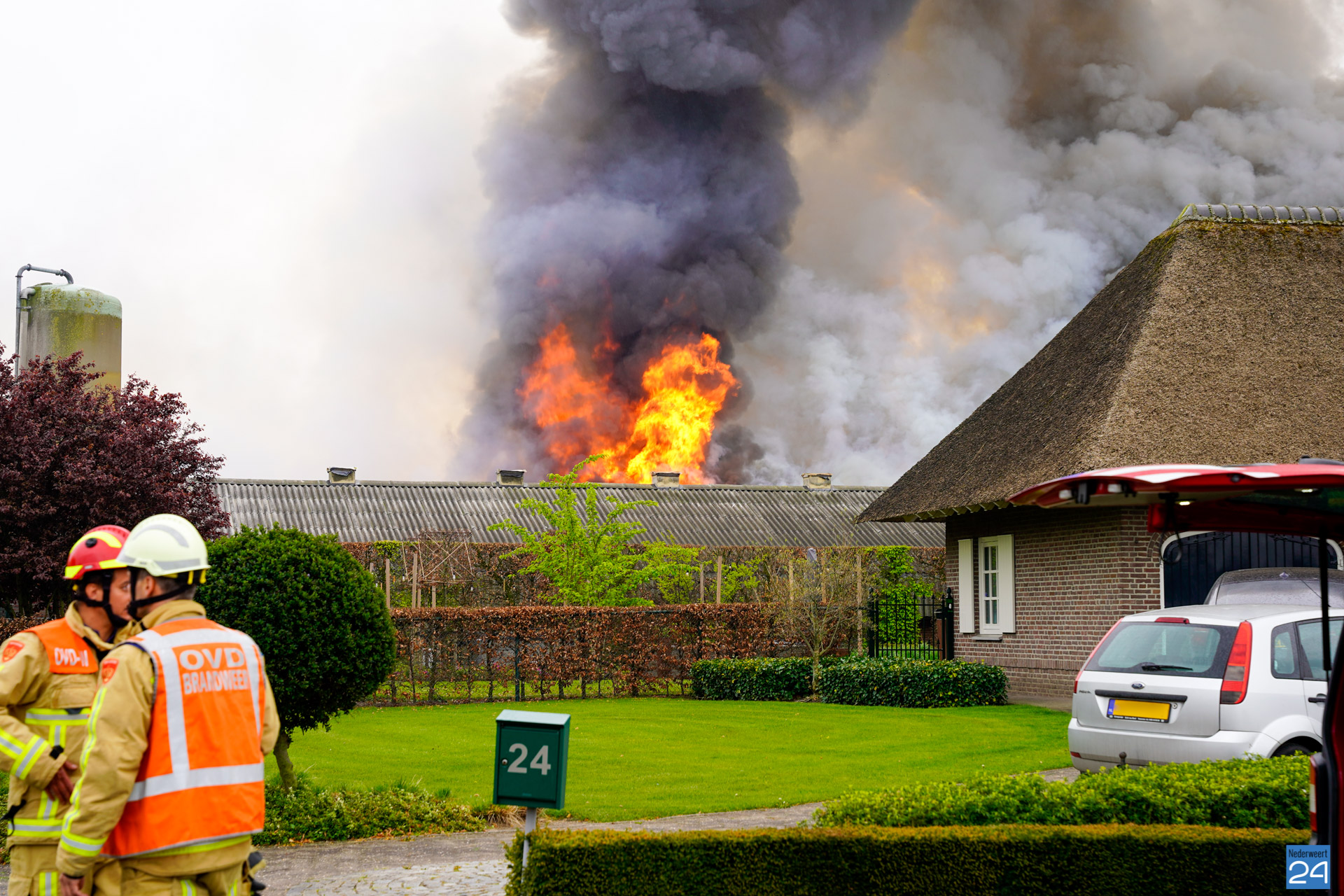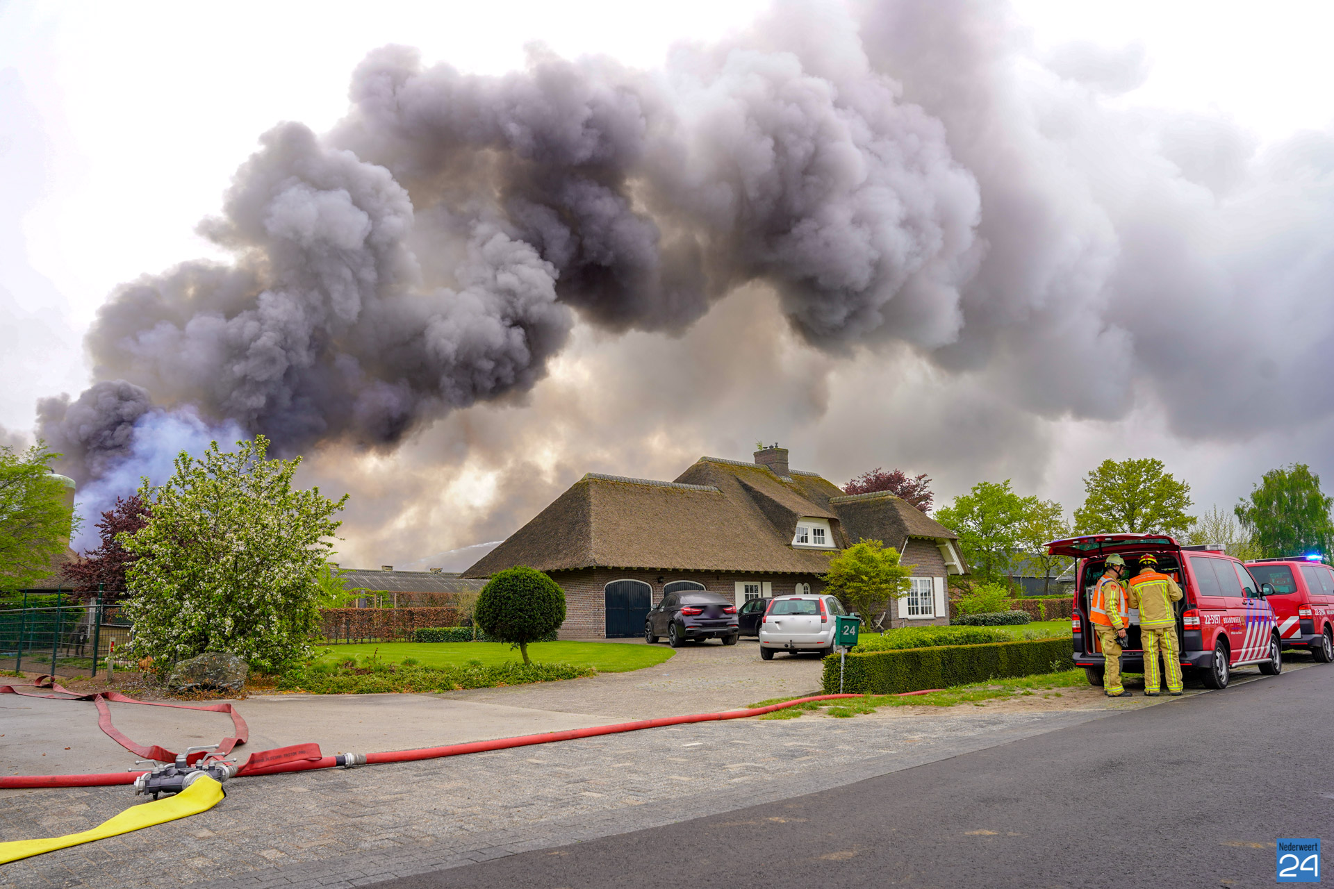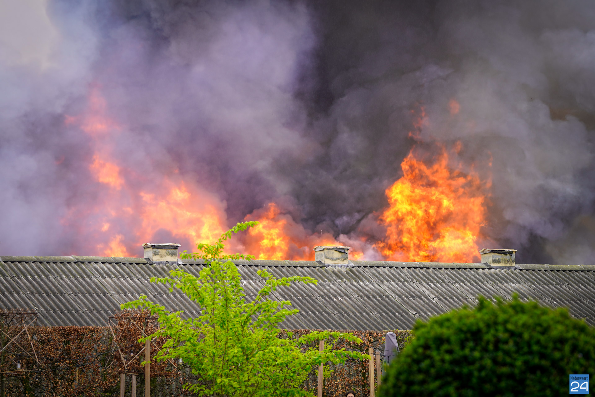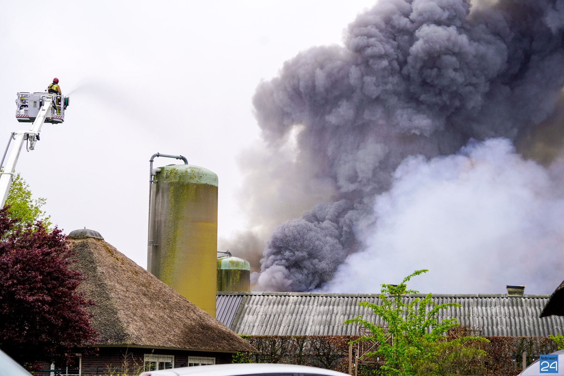 In de wijde omgeving is een donkere rookwolk te zien die boven het bedrijf hangt. De vlammen slaan uit het dak van twee kippenstallen. Duizenden kippen zijn omgekomen.