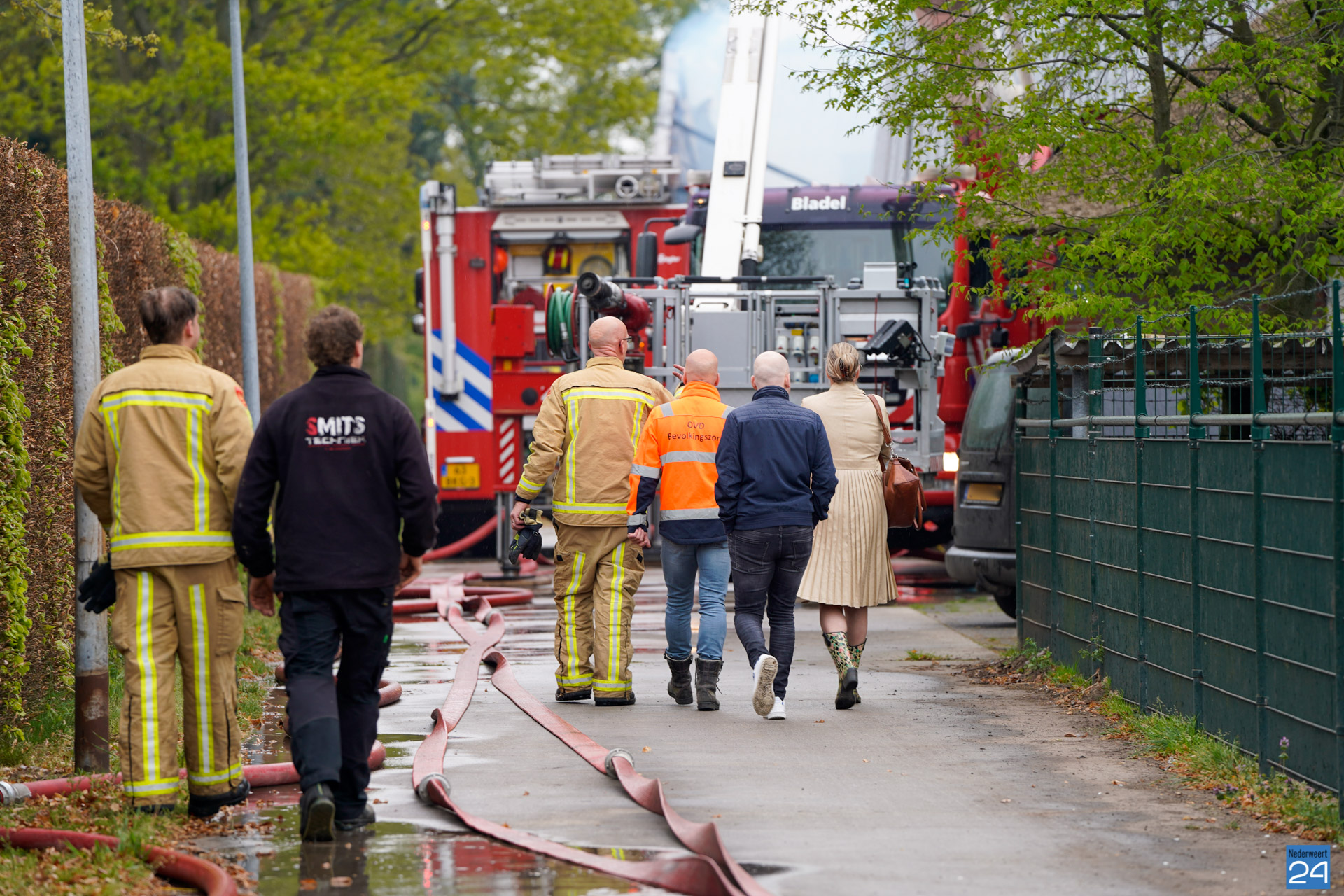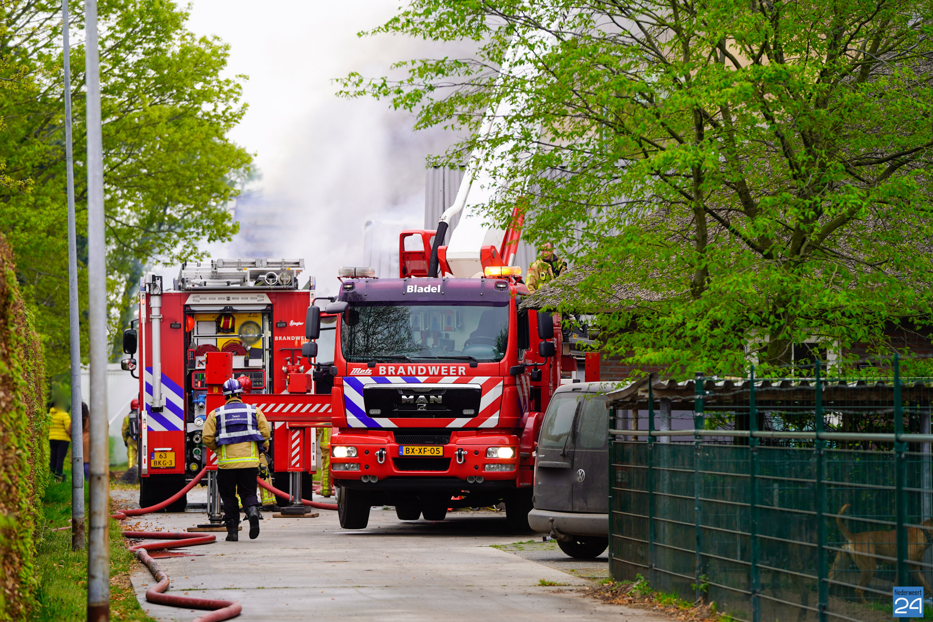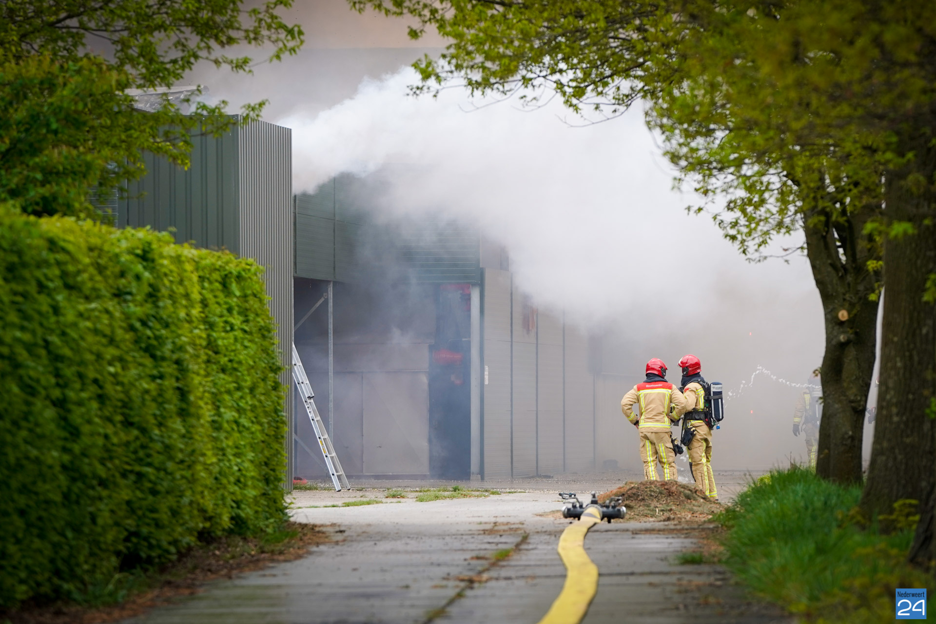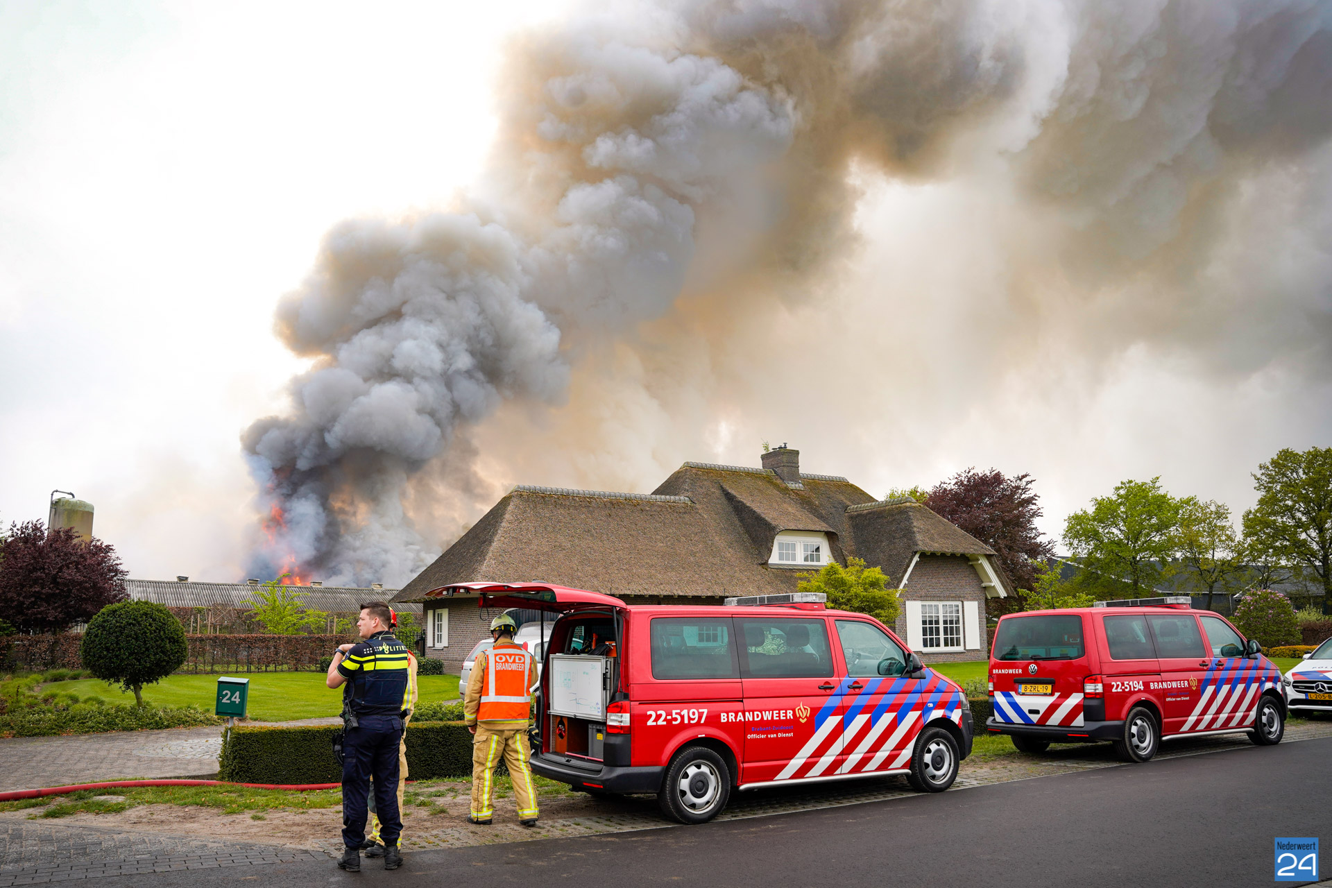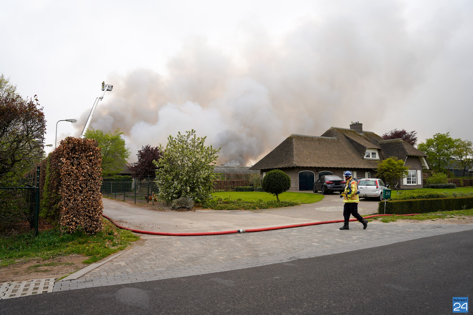 In de wijde omgeving is een donkere rookwolk te zien die boven het bedrijf hangt. De vlammen slaan uit het dak van twee kippenstallen. Duizenden kippen zijn omgekomen.