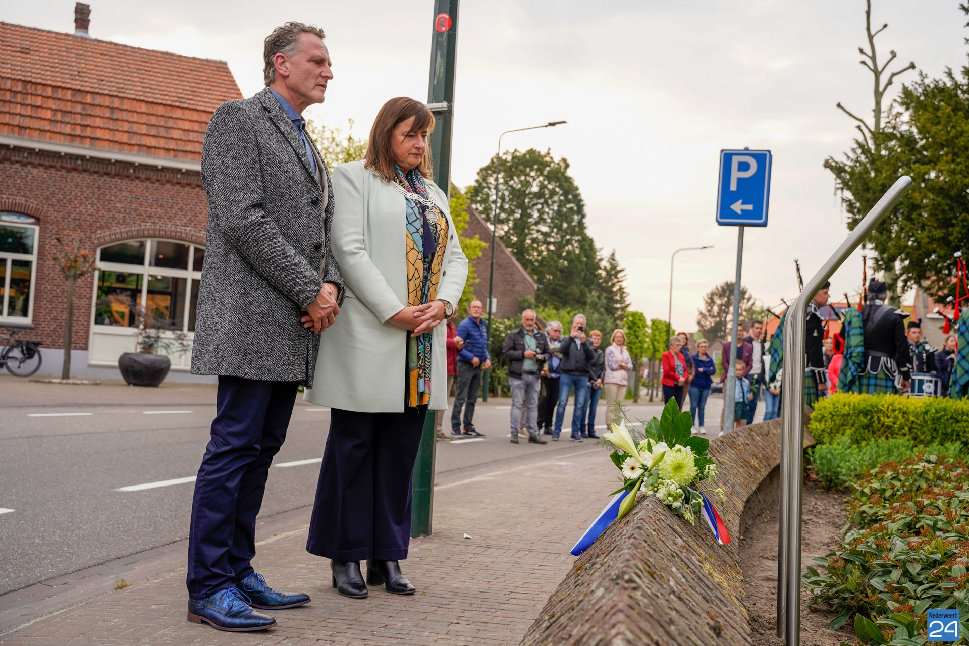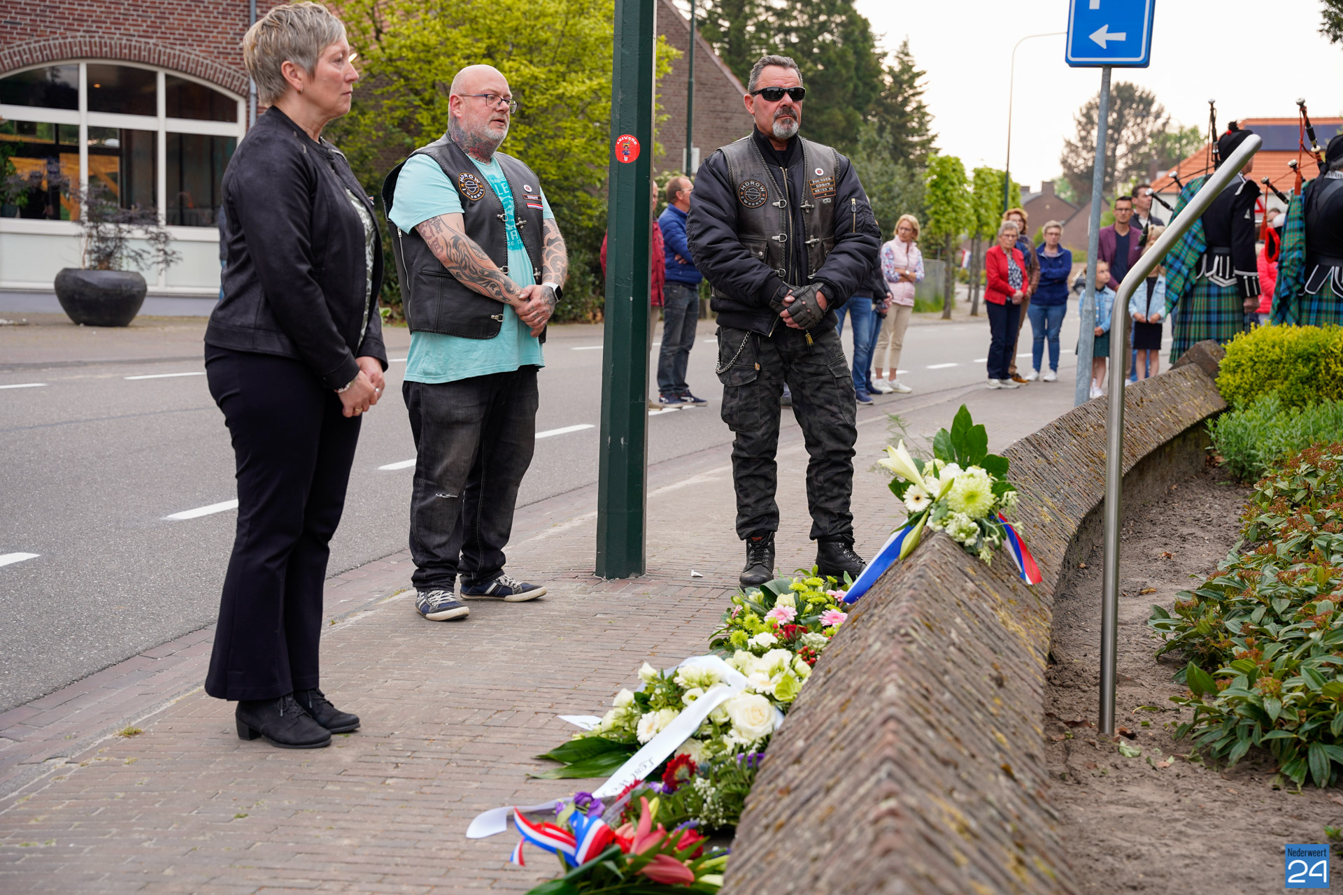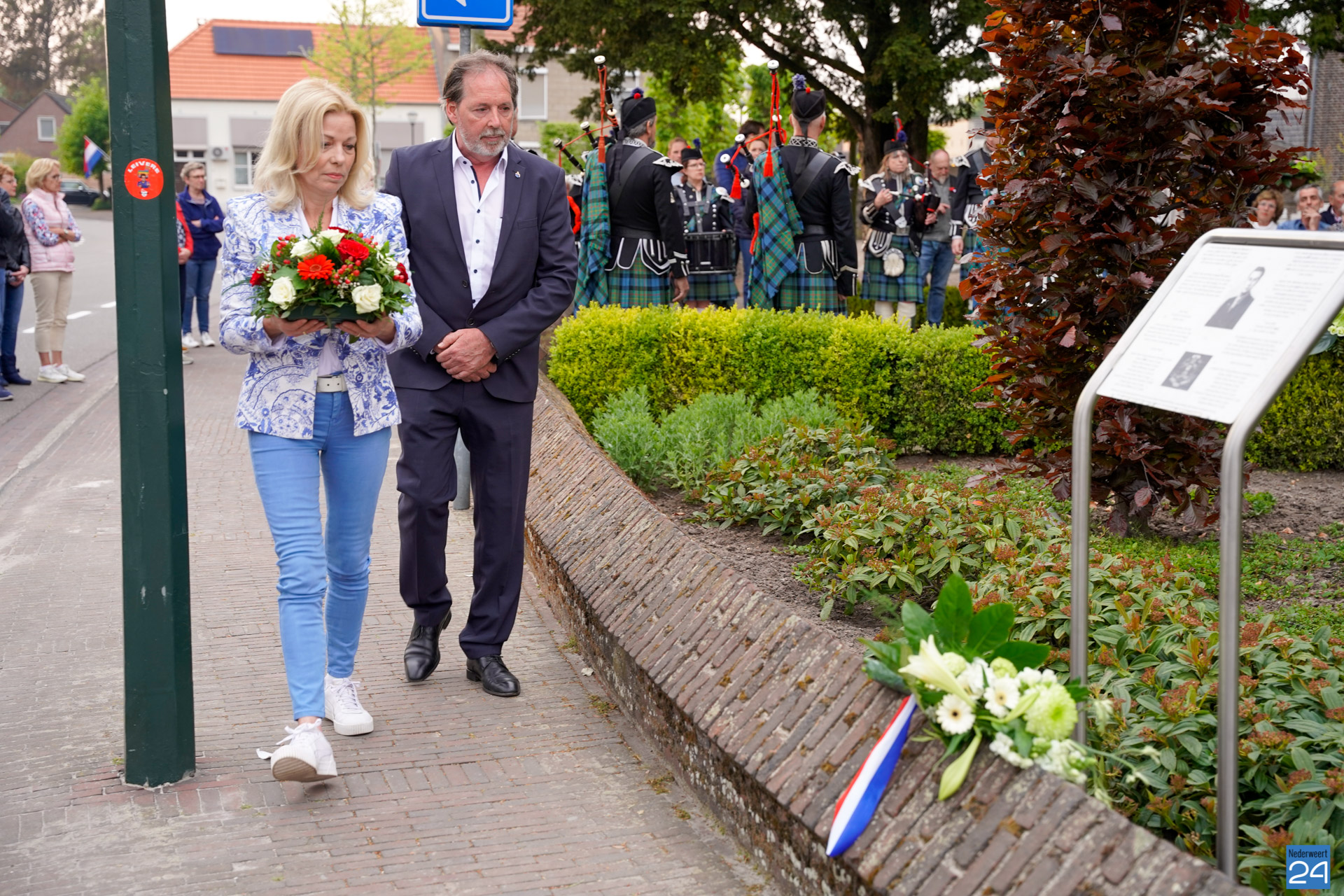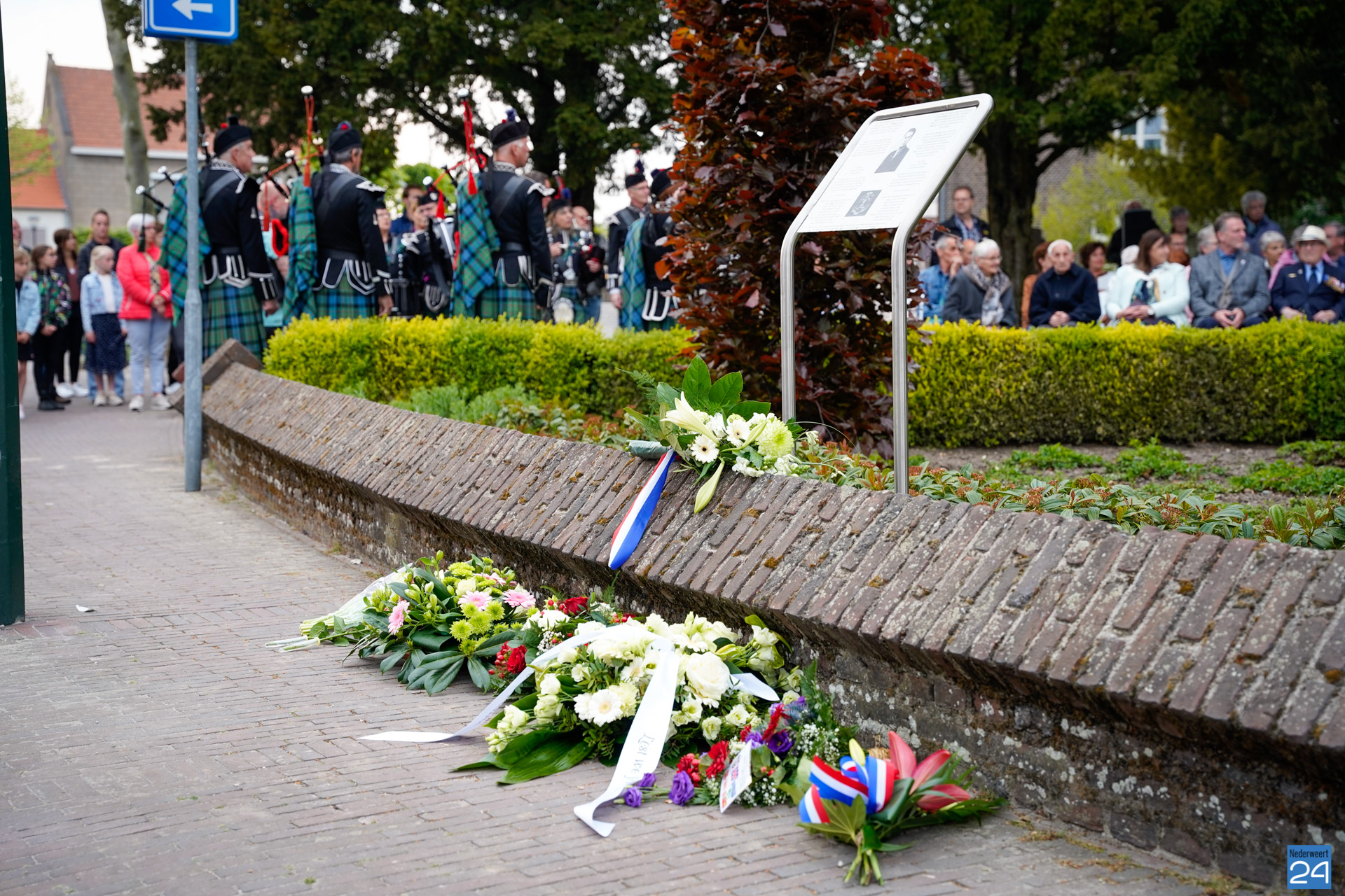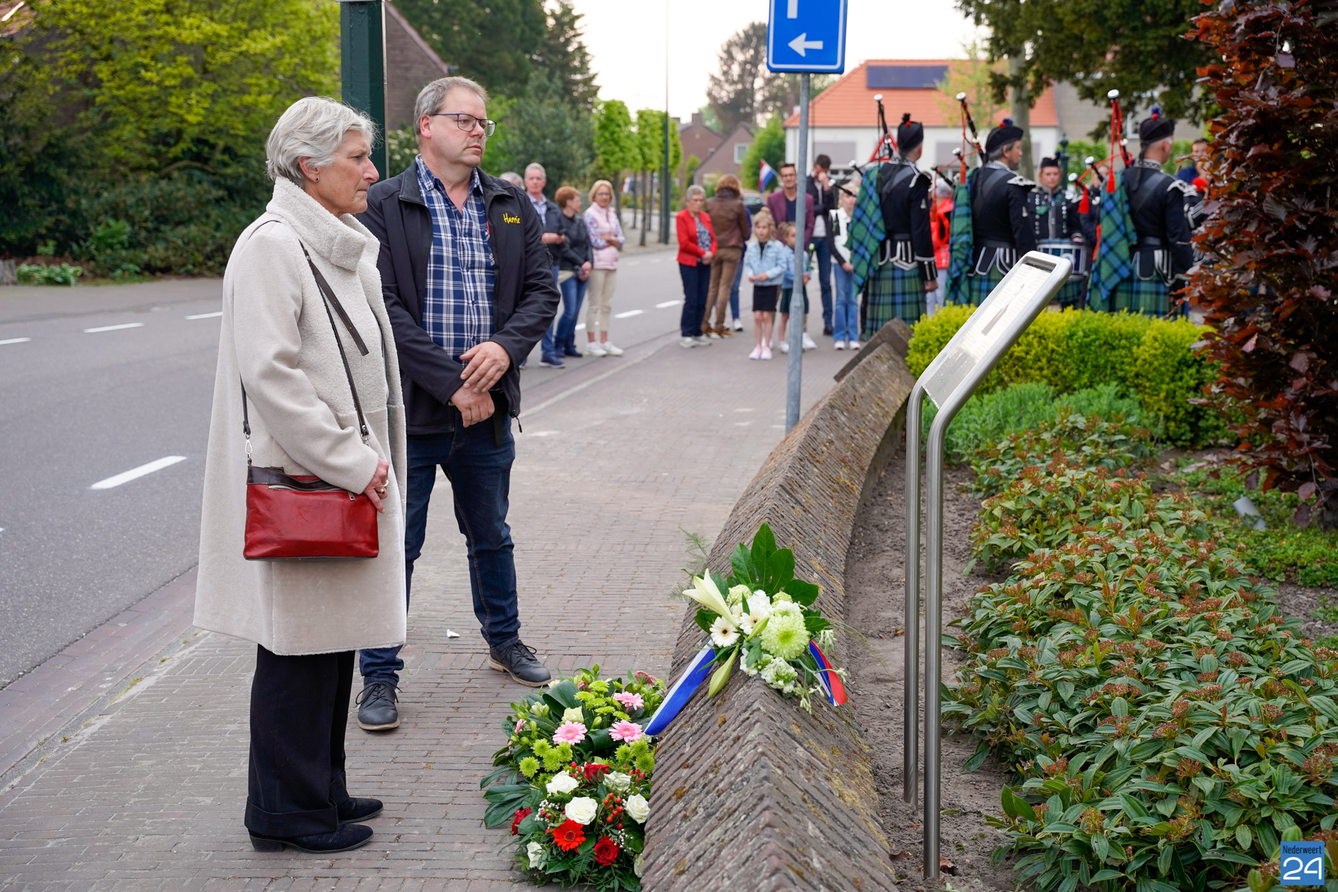 Onder de aanwezigen ook Leo Hendriks uit Heel, voormalig piloot voor de Royal Air Force in de Tweede Wereldoorlog en Pierre van Bommel uit Leveroy, een van de laatste getuigen. Om 19.00 uur begon de ceremonie na het spelen van de doedelzakspelers van Pipers Society Castle Aldenghoor uit Haelen met een begroeting door Pastoor Marcus Vankan, die daarna het woord gaf aan Niek Hendrix namens het Comité. Burgemeester Birgit Op de Laak sprak namens de gemeente Nederweert de aanwezigen toe waarna het monument onthuld werd door de burgemeester en vertegenwoordigers van het comité met op de achtergrond de muziek van fanfare Concordia.