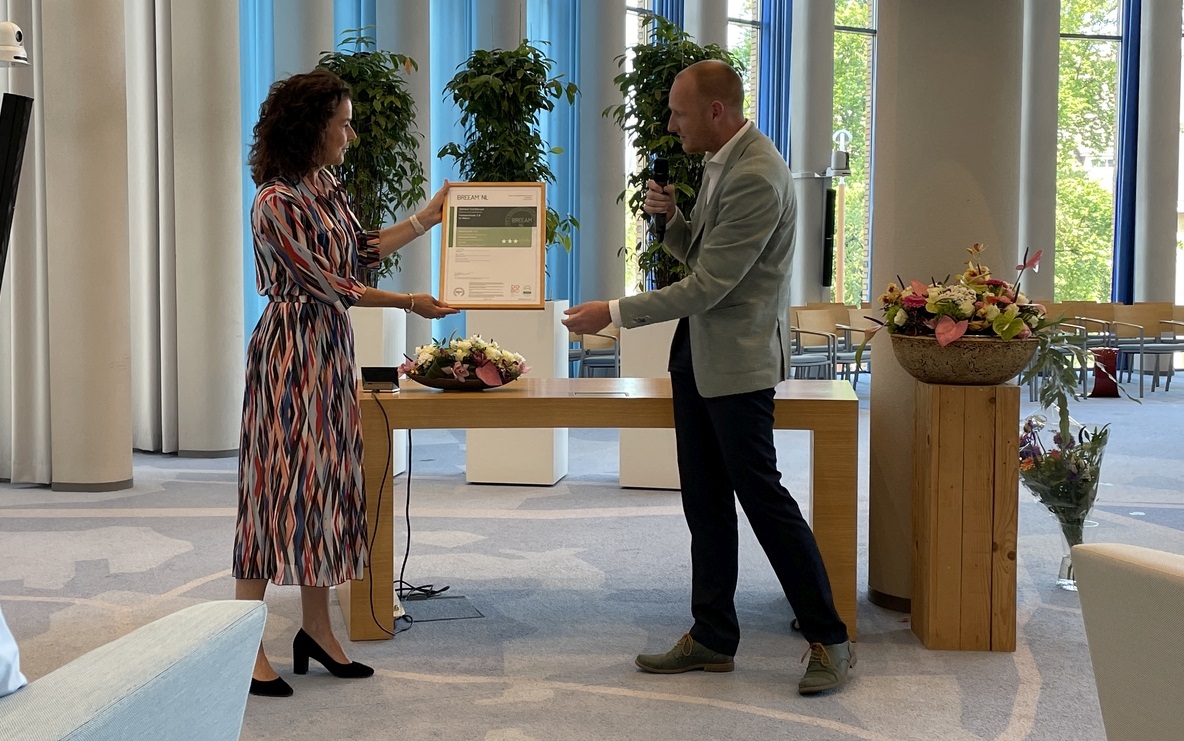 De score is afhankelijk van in hoeverre het project voldoet aan bepaalde duurzaamheidscriteria. De ambitie voor Kampershoek 2.0 was om 3 sterren te halen (prestatie met een score van boven 55%), oftewel een score Very Good. Dat is nu dus gelukt! Vandaag hebben Rudy van der Helm namens DGBC en Jos Schild (de BREEAM-NL Assessor die het traject beoordeeld heeft) het certificaat uitgereikt aan wethouder Wendy van Eijk van de gemeente Weert.