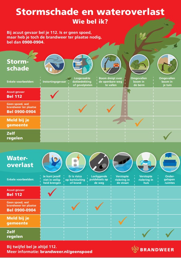 In Limburg is er kans op (zeer) zware windstoten van ruim 100 km/u, lokale wateroverlast en grote hagel van 2 cm of meer. Hierdoor kan schade en gevaar ontstaan als gevolg van omvallende bomen, rondvliegende voorwerpen en blikseminslag. Hiervoor is code oranje van kracht.
