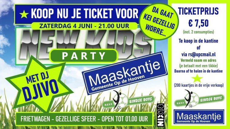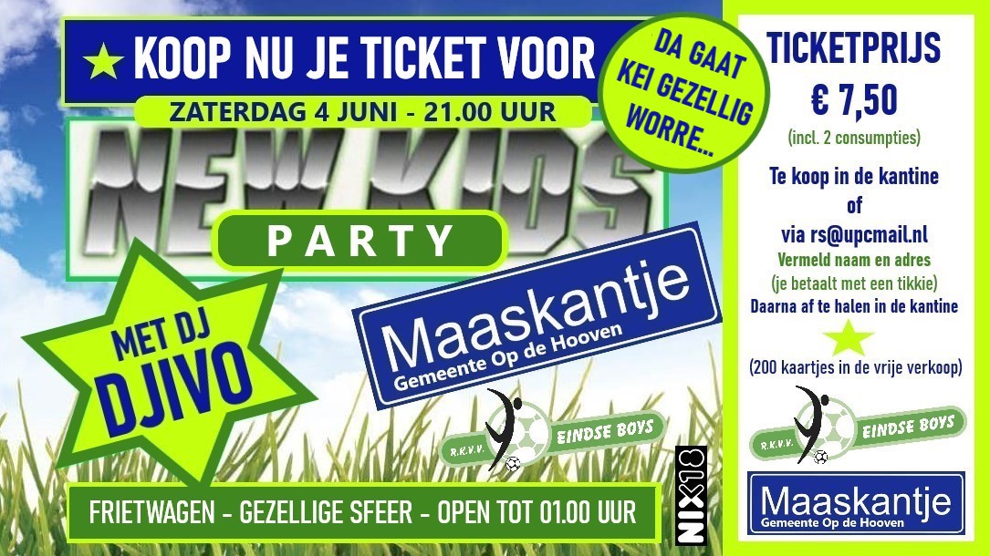 Koop nu je ticket voor een geweldige party op zaterdag 4 juni. Nodig je vrienden en vriendinnen uit en beleef een super gezellige avond in de kantine van Eindse Boys. DJ DJIVO zorgt tijdens deze New Kids Party voor de juiste sfeer op deze voor en door de jeugd georganiseerde avond.