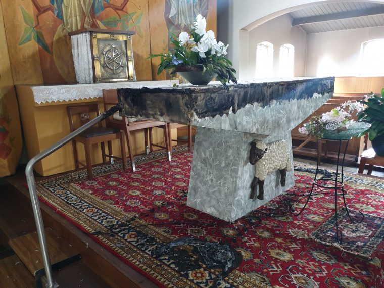 Op het altaar zijn de ‘altaardwalen‘ in brand gestoken en daardoor is het altaar vernield. Ook het tapijt onder het altaar is zwaar beschadigd.