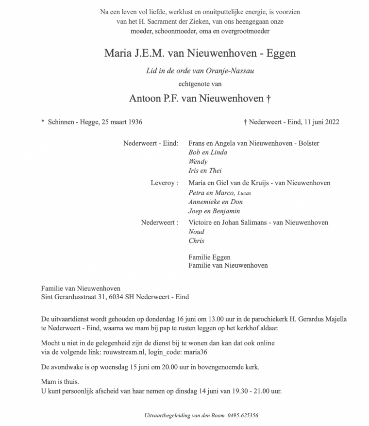 Overlijdensbericht: Maria van Nieuwenhoven – Eggen †