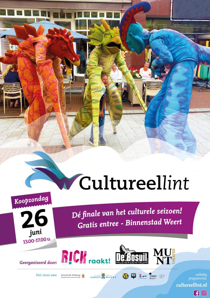 Cultureel Lint is hét podium voor professionele- en amateurkunstenaars, verenigingen en culturele instellingen, die het publiek laten genieten van allerlei kleine, gratis voorstellingen en presentaties op het gebied van muziek, theater, literatuur, beeldende kunst en meer. Tijdens koopzondag 26 juni barst cultureel Weert uit zijn voegen met een gevarieerd programma voor jong en oud.