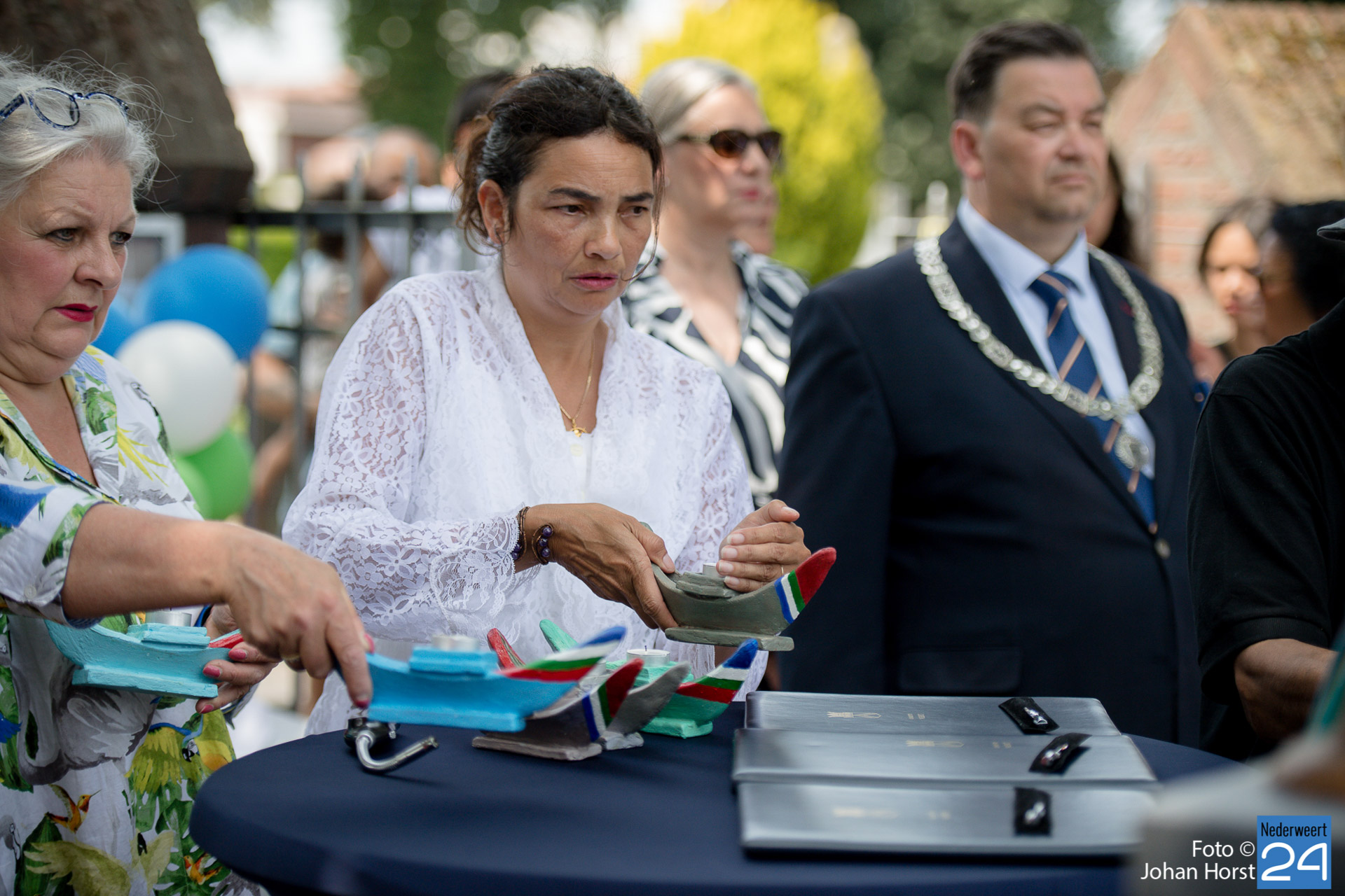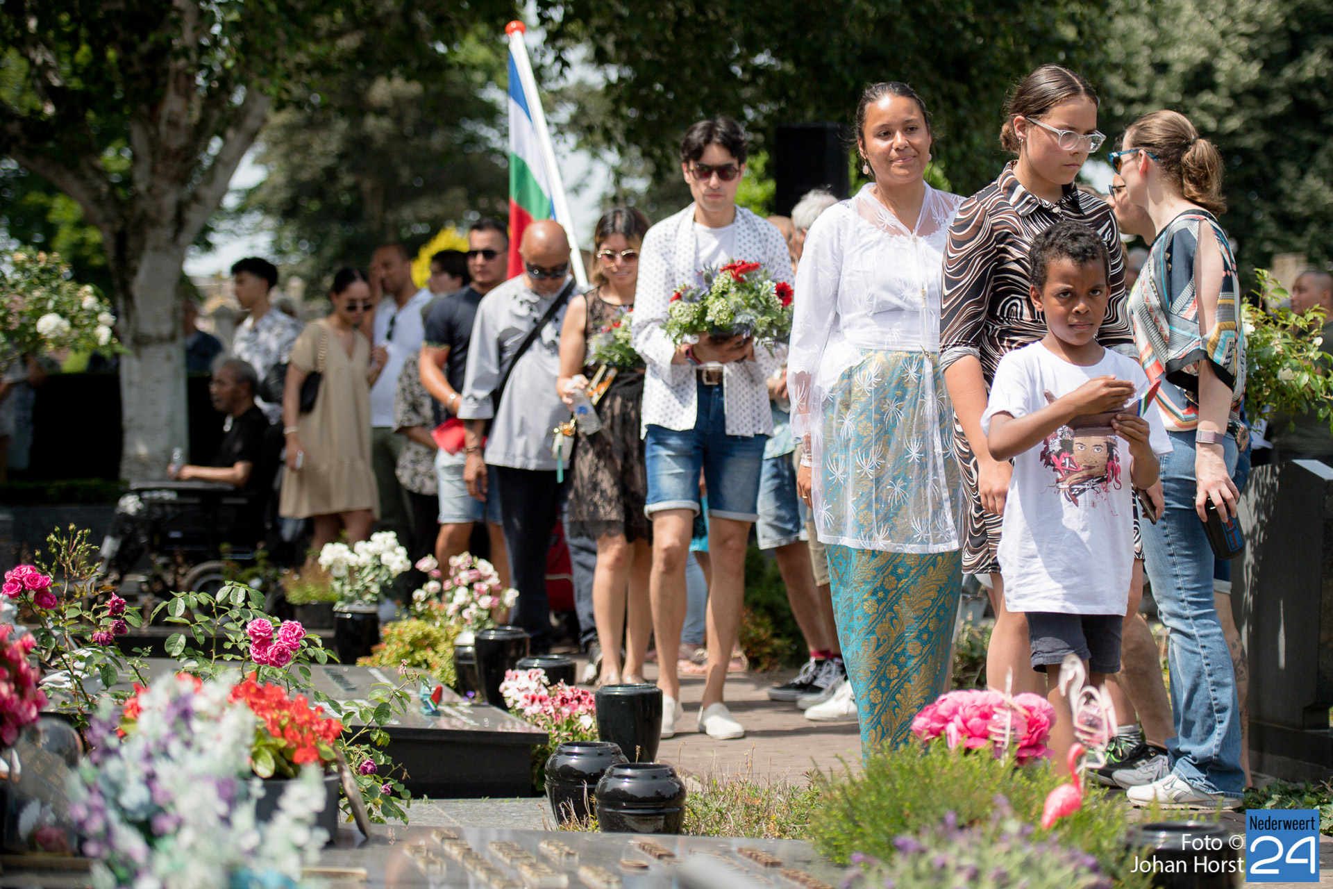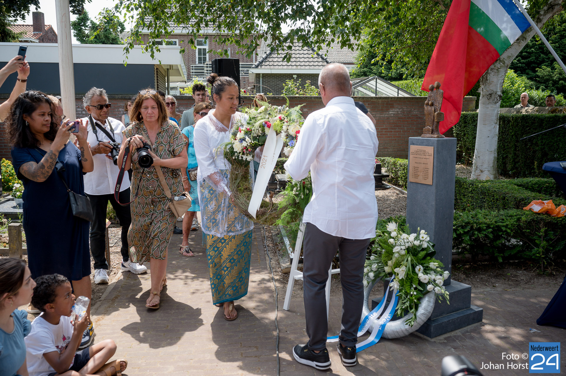 Tot slot werd als symbool één door Ruud Hehanussa ontworpen bootje/prauw, door een kleinkind c.q. achterkleinkind op het graf van haar/zijn grootouders geplaatst. Na afloop van beide plechtigheden was er in café-zaal Jonas op Leuken, voor de genodigden, nog gelegenheid om na te praten onder genot van een drankje”.