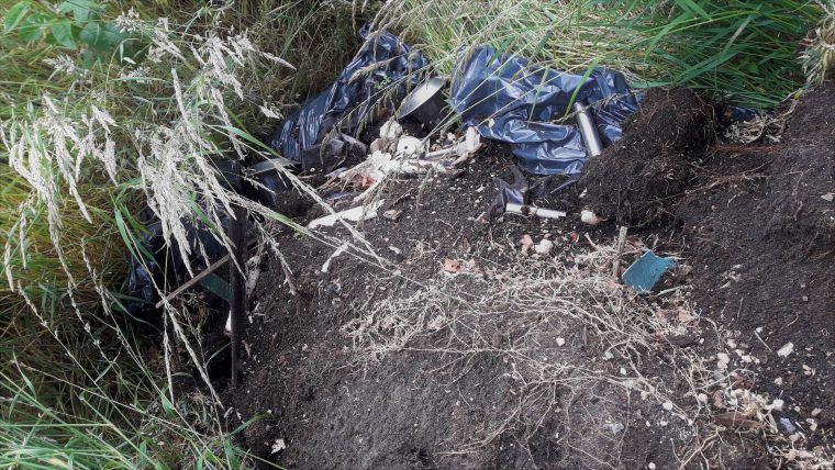 Een mooie dag om de tuin aan te pakken. Ach, is de milieustraat net dicht. Nou, dan gooien we de restanten van de oude tuin maar in de berm. Een oude tuin is ook natuur toch? “En dan ook de hele zooi hè“. De plastic zakken en de tuinverlichting erbij. Kunnen de vlindertjes ’s nachts het licht aan doen in de berm van de Kampersweg.