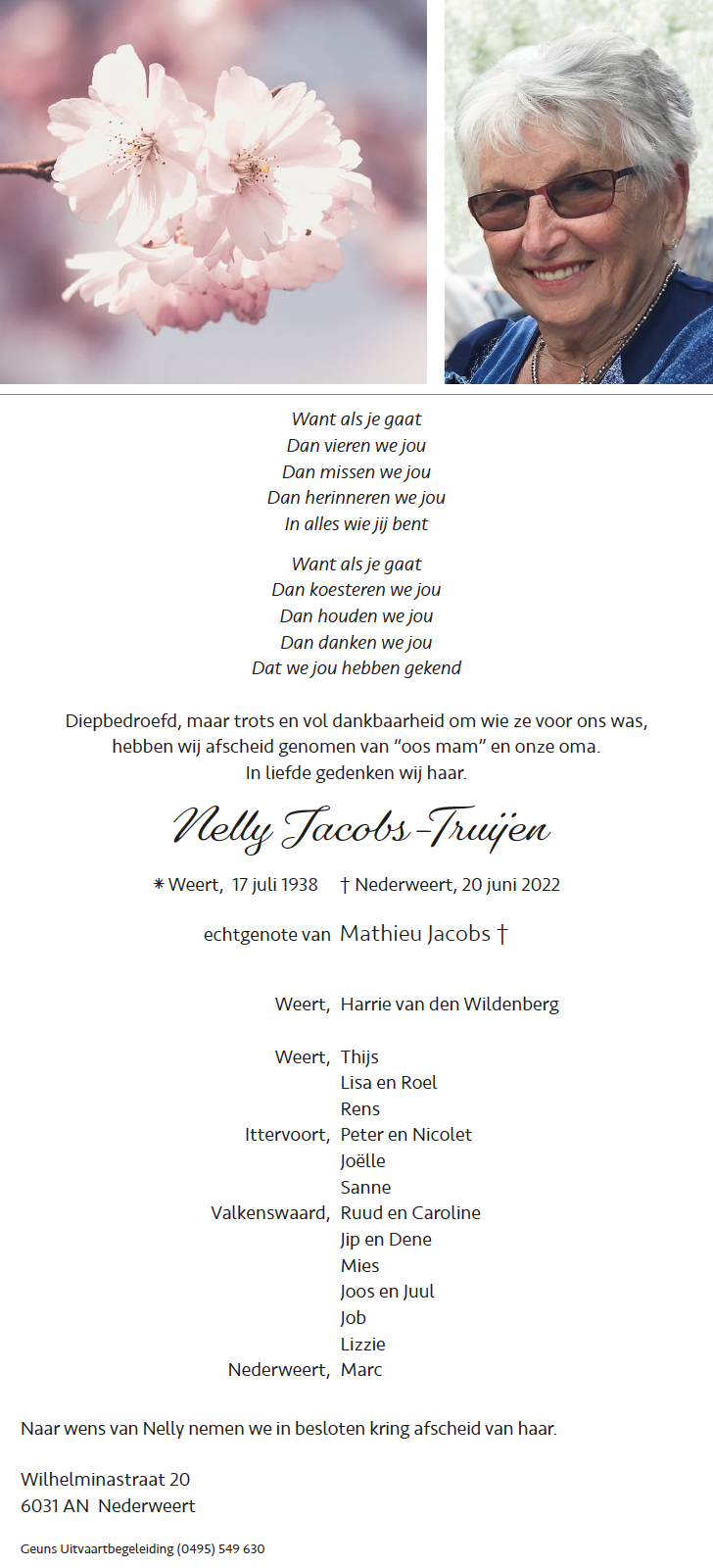 Overlijdensbericht: Nelly Jacobs – Truijen †