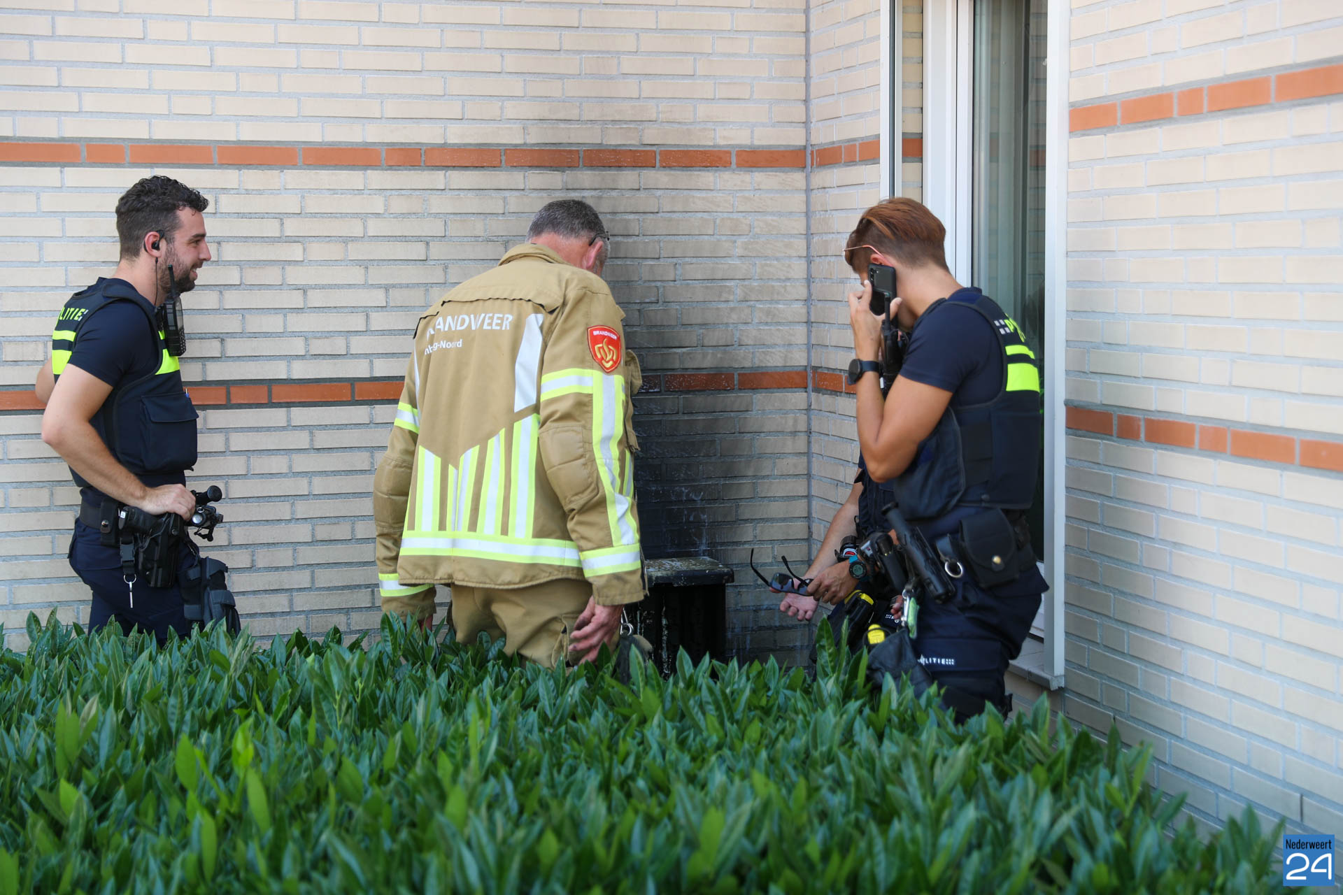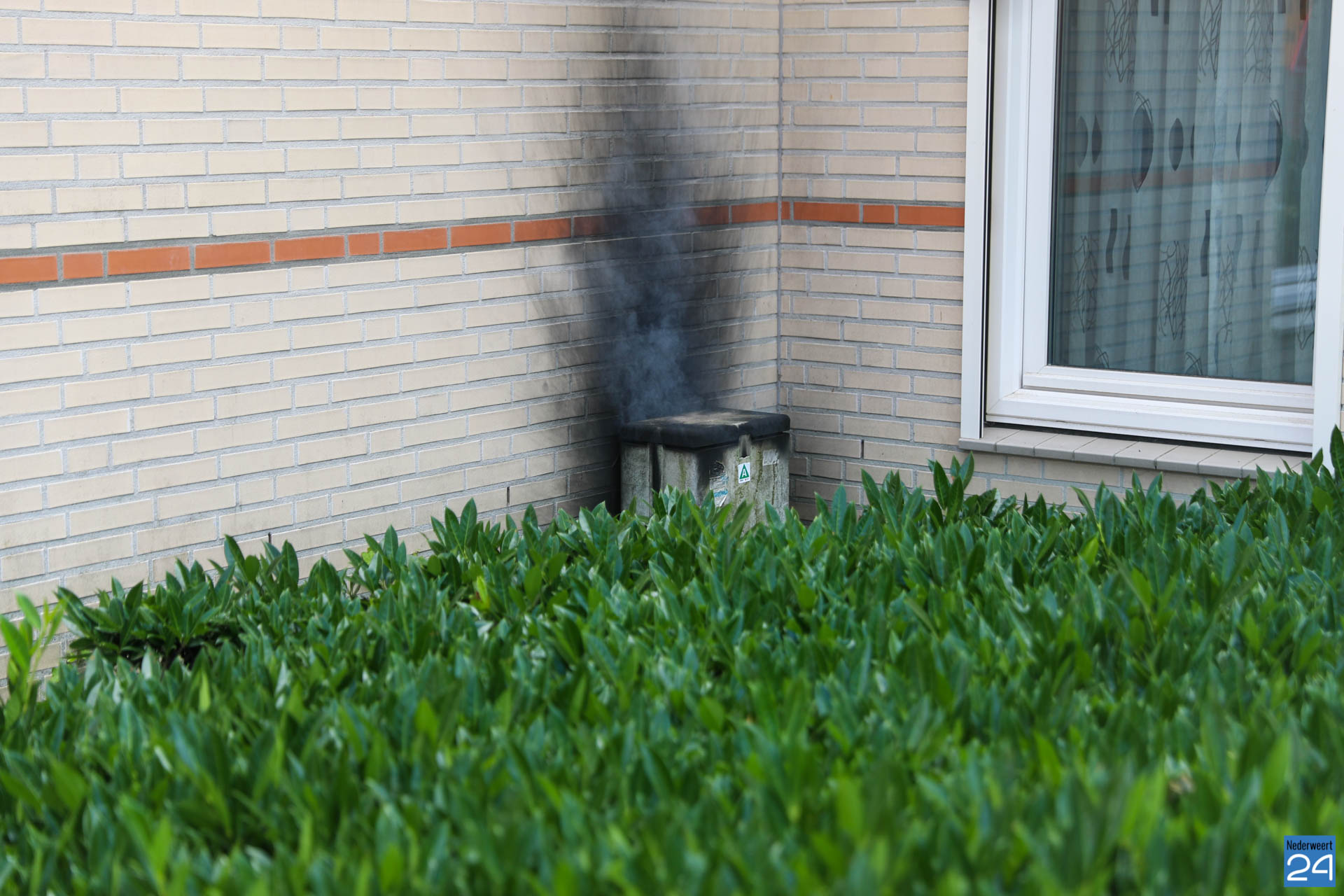 De stroomkast stond tegen het appartementencomplex. Voorbijgangers hoorde een paar flinke knallen en daarna een brand en rook in een hoek van het gebouw.