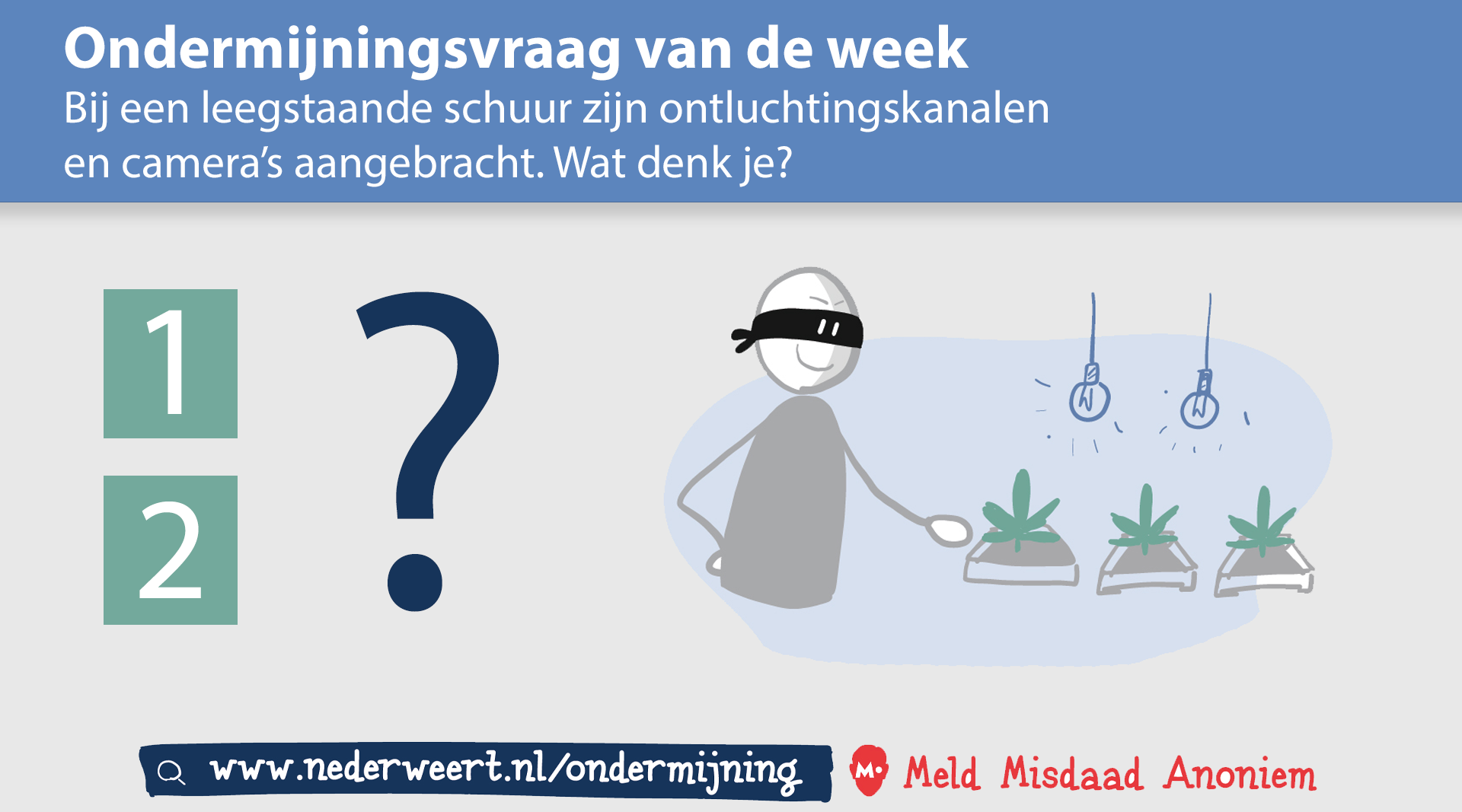 Zie, ruik of hoor jij bovenstaande signalen, maak dan anoniem melding via het meldpunt of via Meld Misdaad Anoniem: 0900-8000.