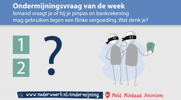 Geldezel, money mule of katvanger: Het zijn allemaal termen voor mensen die door criminelen geronseld worden om hun betaalpas en pincode af te staan of een telefoonabonnement af te sluiten. Meestal wordt er een mooie beloning in het vooruitzicht gesteld: “Sluit jij even een telefoonabonnement voor me af, krijg jij €200,- van me want mijn vriendin mag het niet weten”. Of: “Hey mijn bankkaart is kwijt en de nieuwe is onderweg. Leen me de jouwe eens even”. Trap er niet in, want de kans is groot dat je als geldezel gebruikt wordt!
