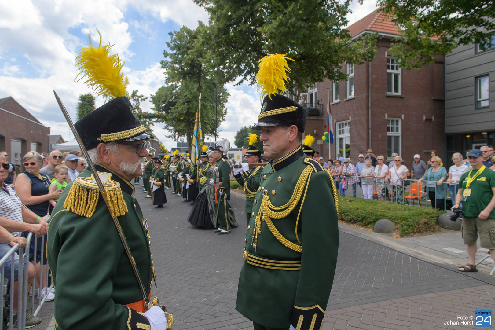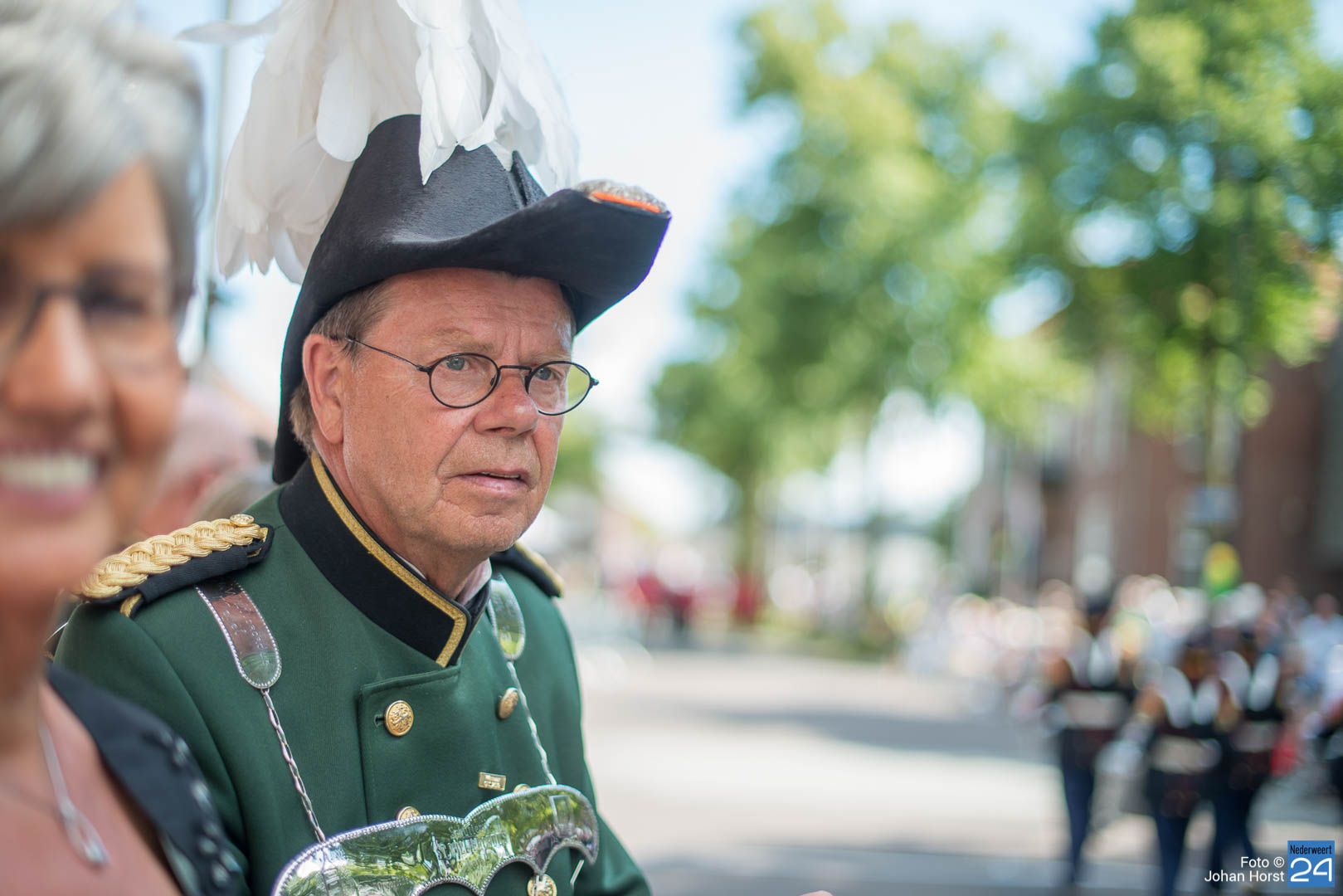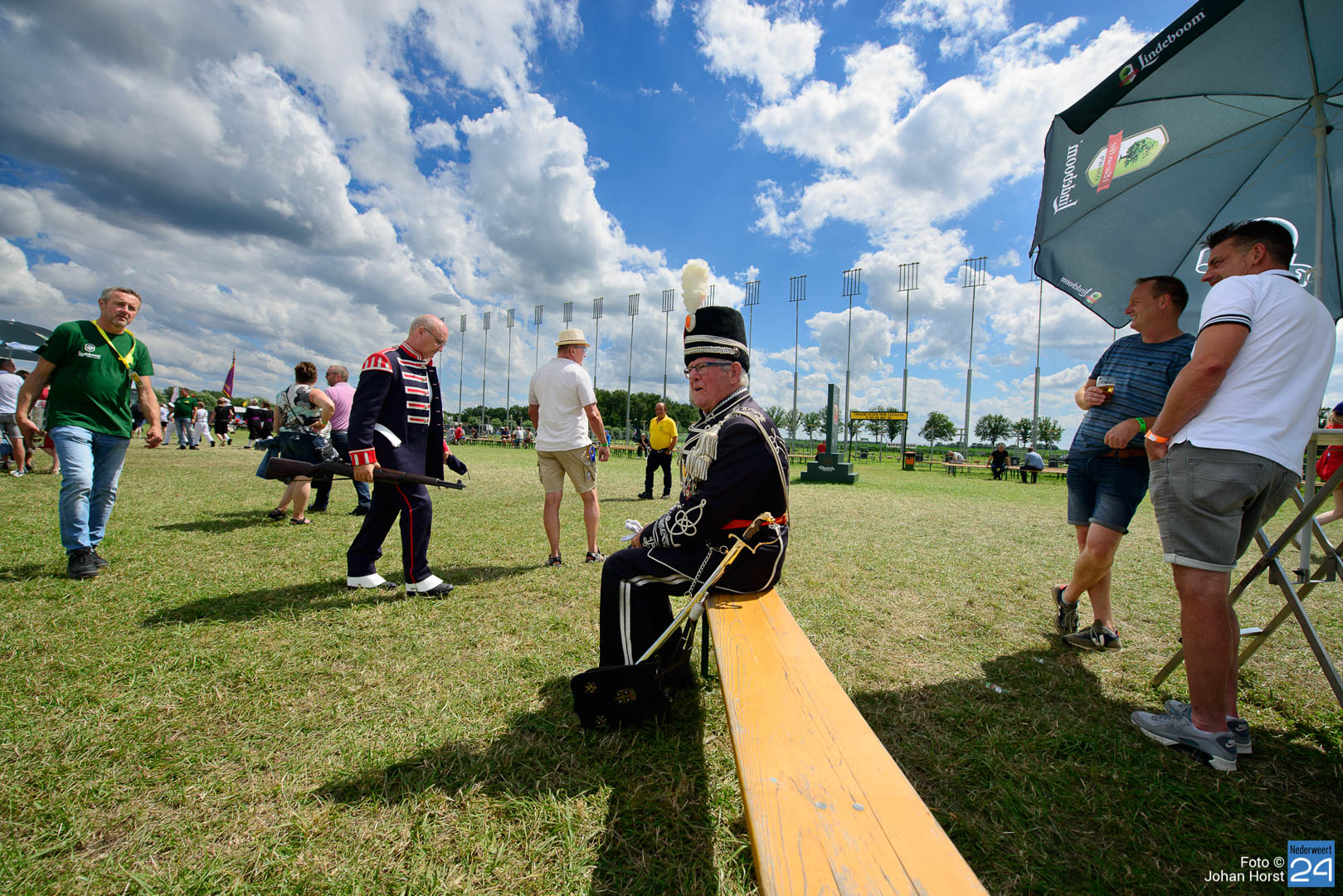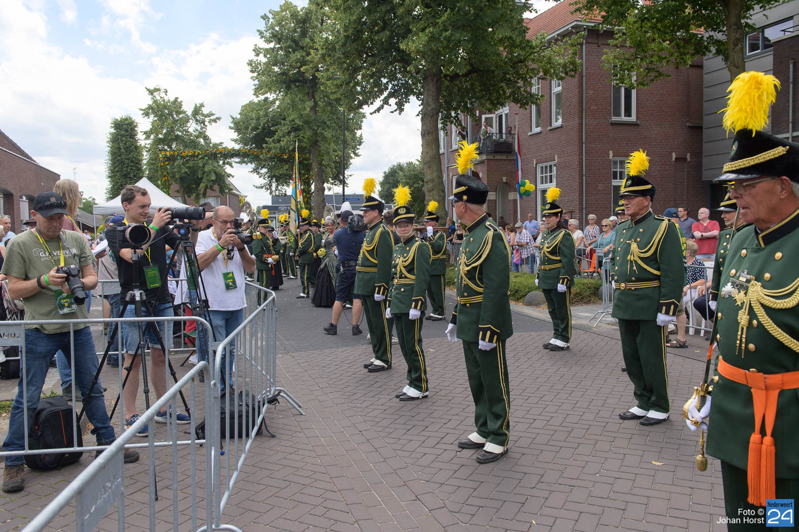 De schutterijen droegen hun militaire outfit, gilde-uniformen of fantasiekostuums. Allen met bordjesdrager, bielemannen of sappeurs, tambourmaître met drumband, marketentsters, het schutterijvaandel met daarachter de koning met zijn koningin, eventueel een keizerspaar, dan de officieren en tenslotte de geweerdragers (soldaten of fuseliers).