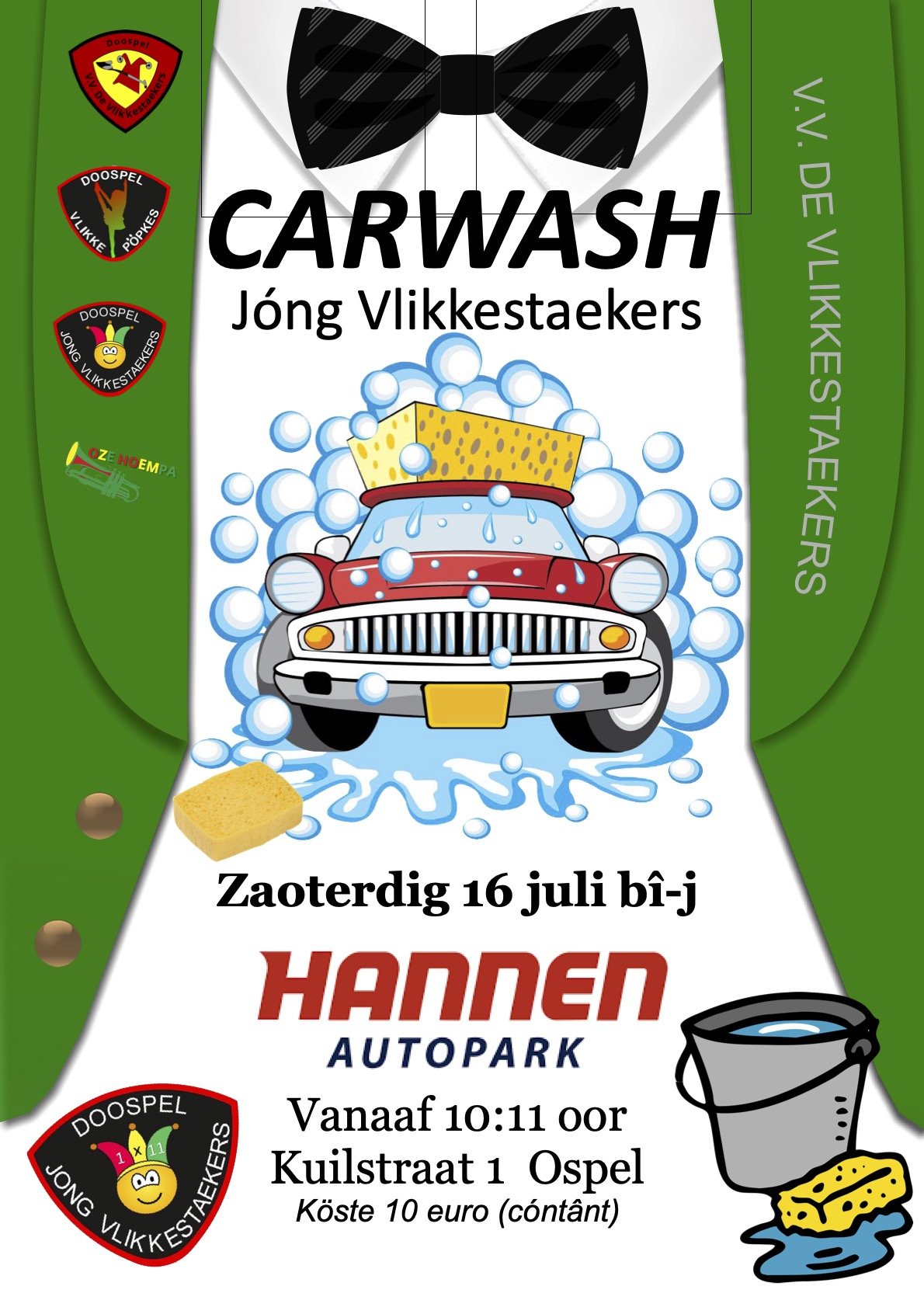 Compleet nieuwe hesjes en steken voor de raad van elf en adjudanten en hesjes en mantels voor het prinsenpaar zijn echter een behoorlijke kostenpost en daarom gaan veel oud Jong Vlikke helpen om daar hun steentje aan bij te dragen. Op zaterdag 16 juli helpen ze namelijk mee met een carwash om zo een mooi bedrag bij elkaar te wassen voor de nieuwe outfits.