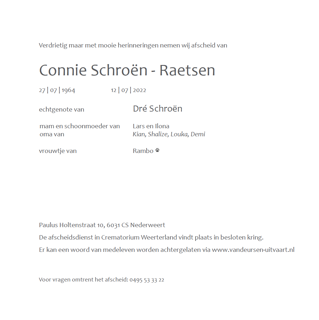 Overlijdensbericht: Connie Schroën-Raetsen †
