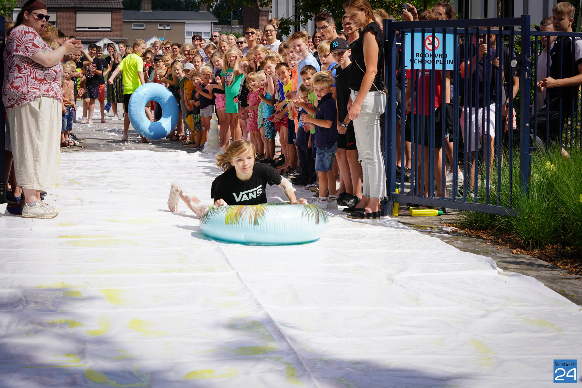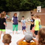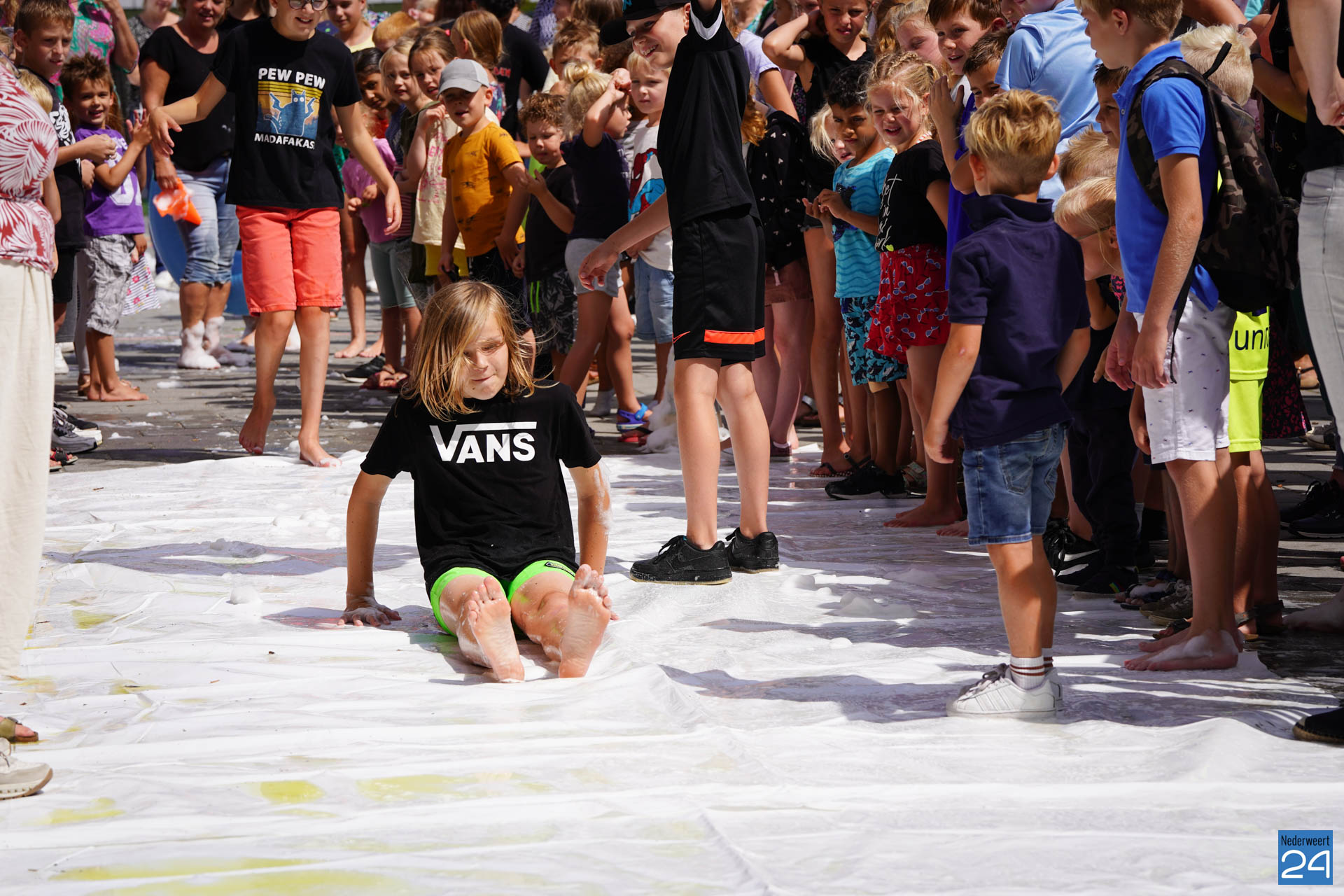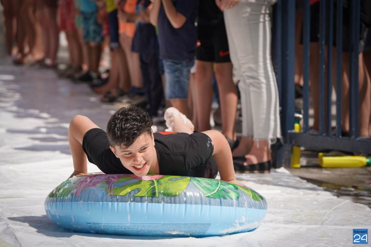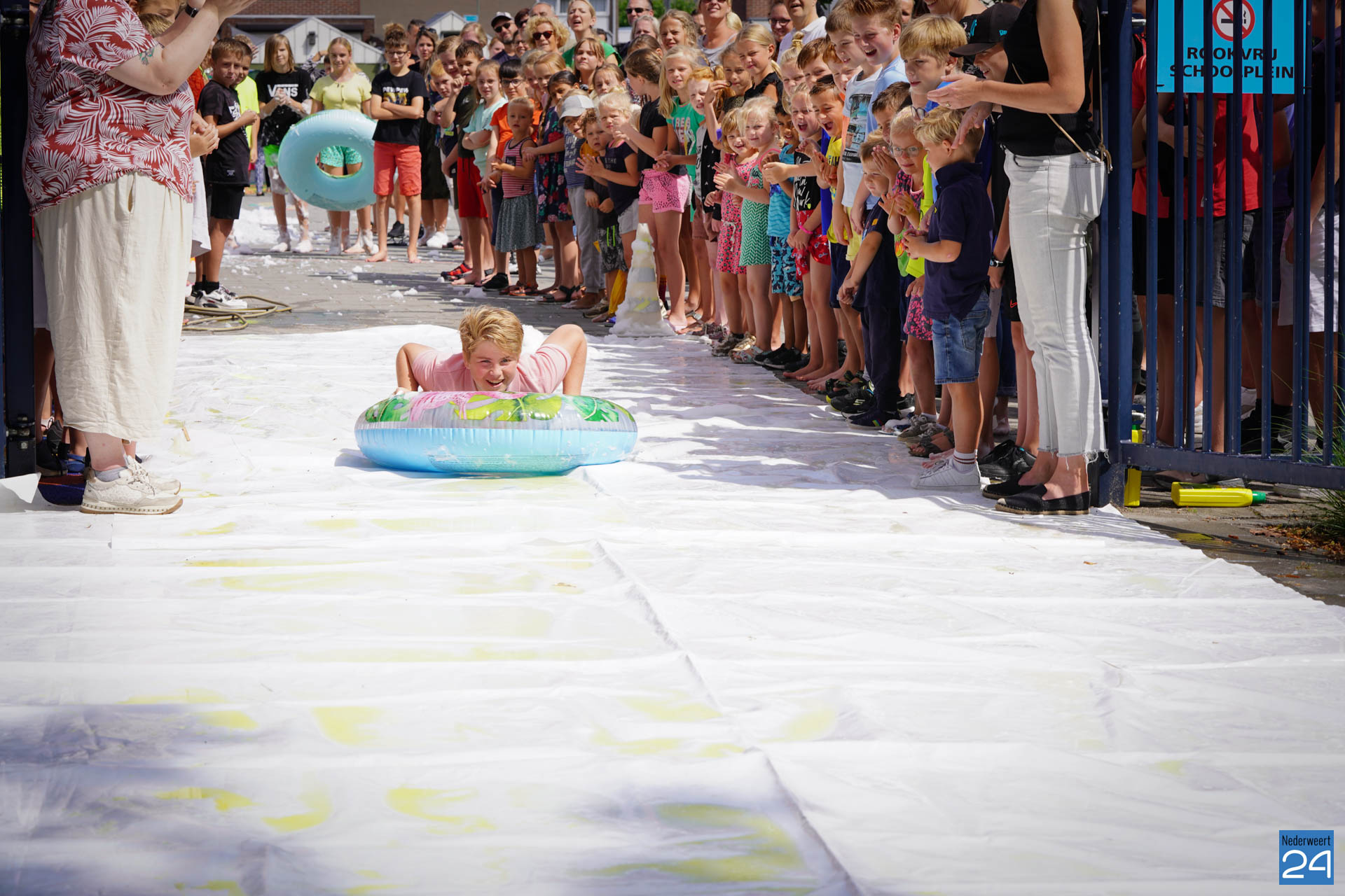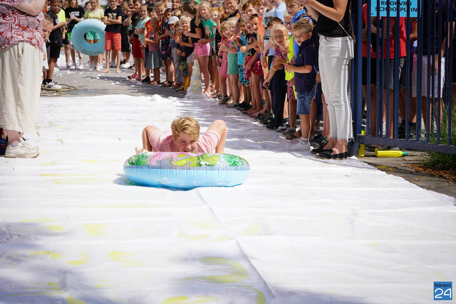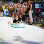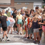Na het ontbijt werd er afscheid genomen van de juf waarna er nog een spel gespeeld werd. De dag werd afgesloten met een schuimparty en inmiddels, volgens traditie, het uitglijden van groep 8!