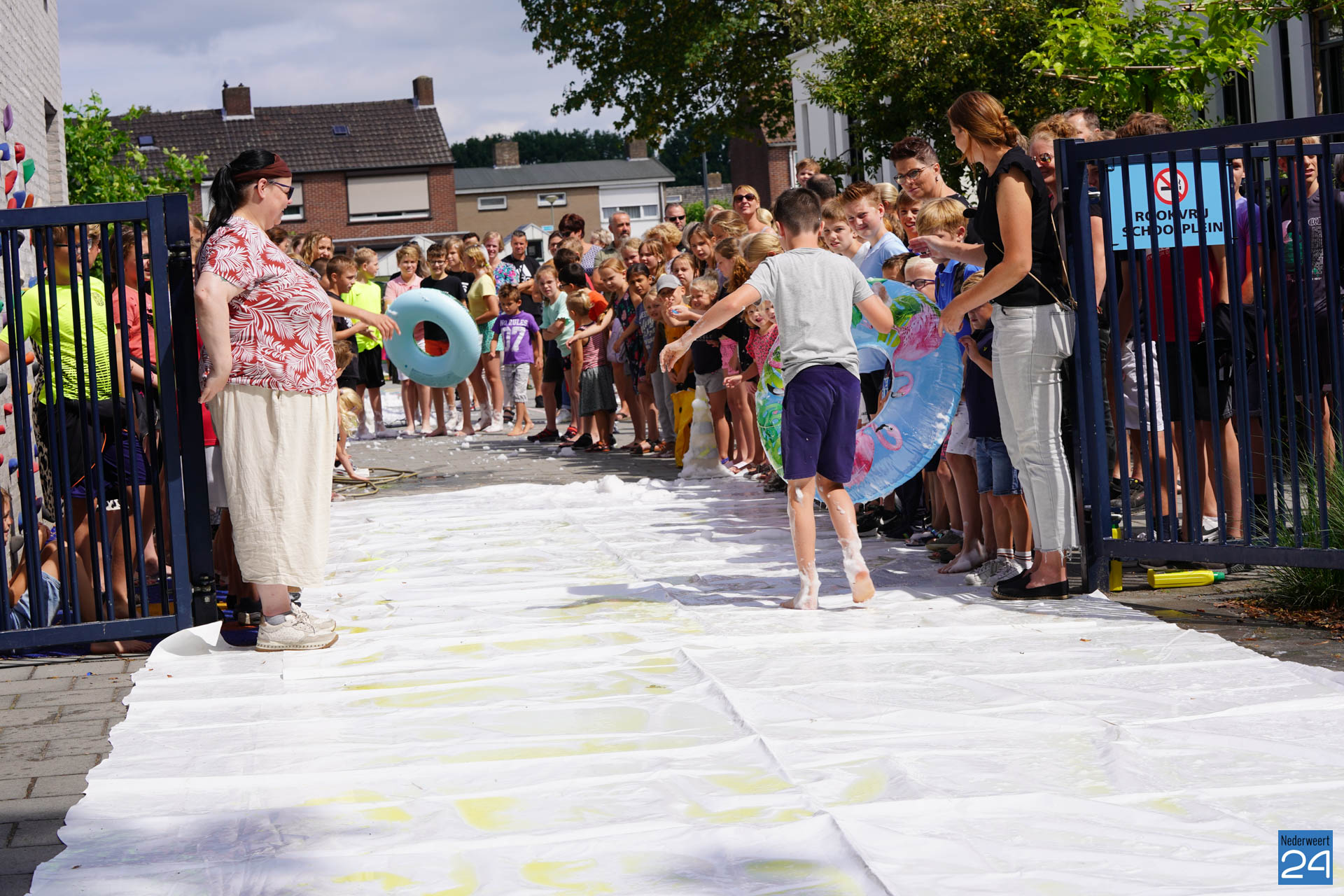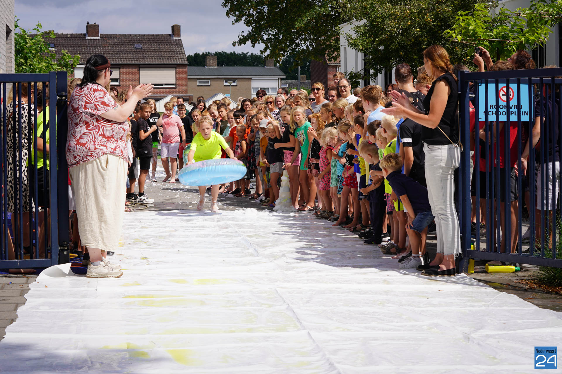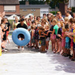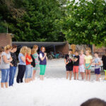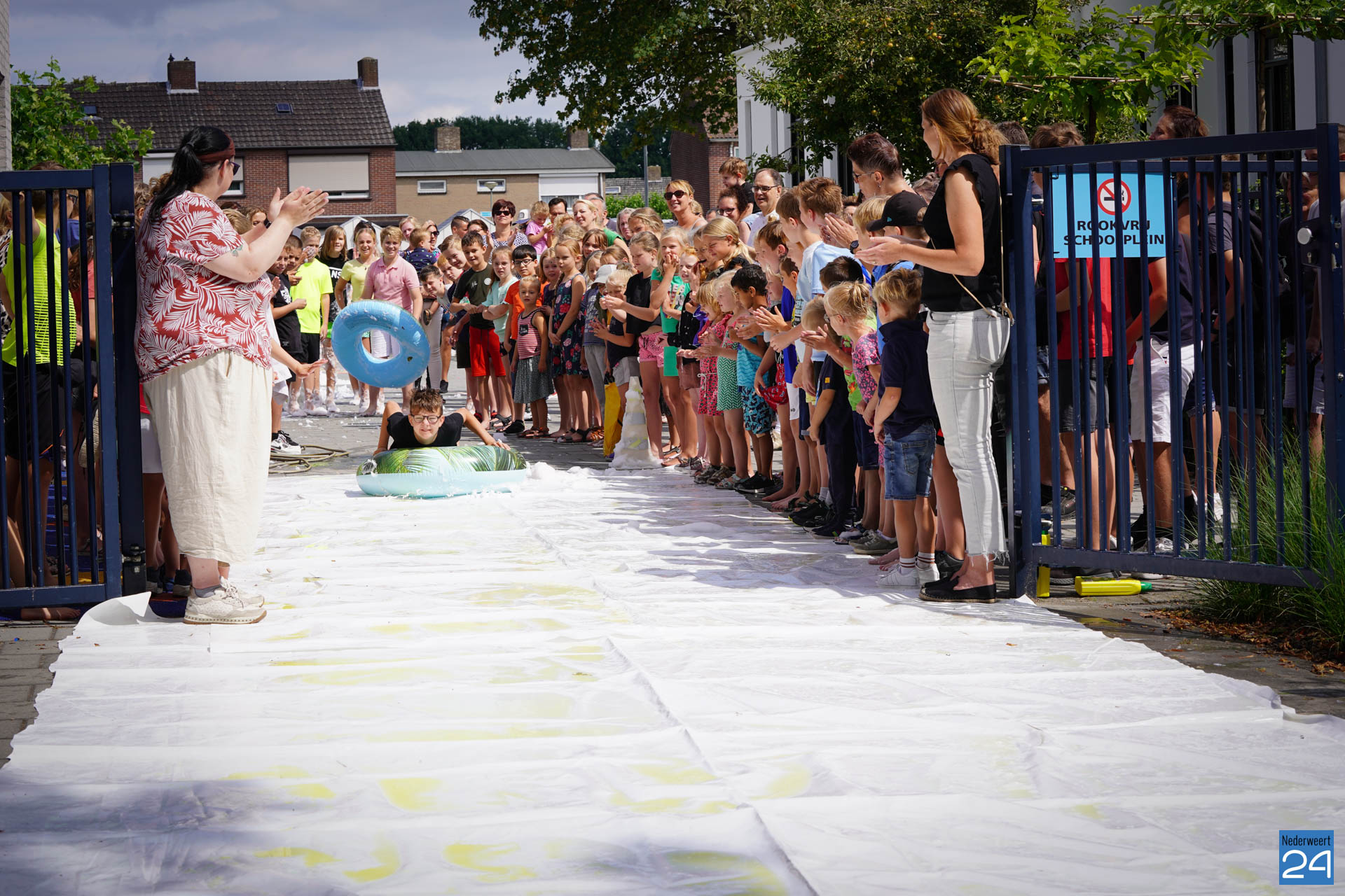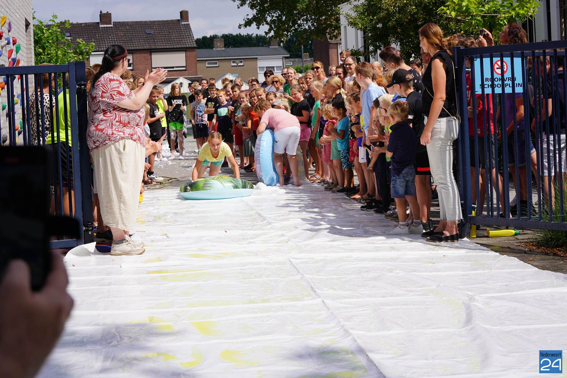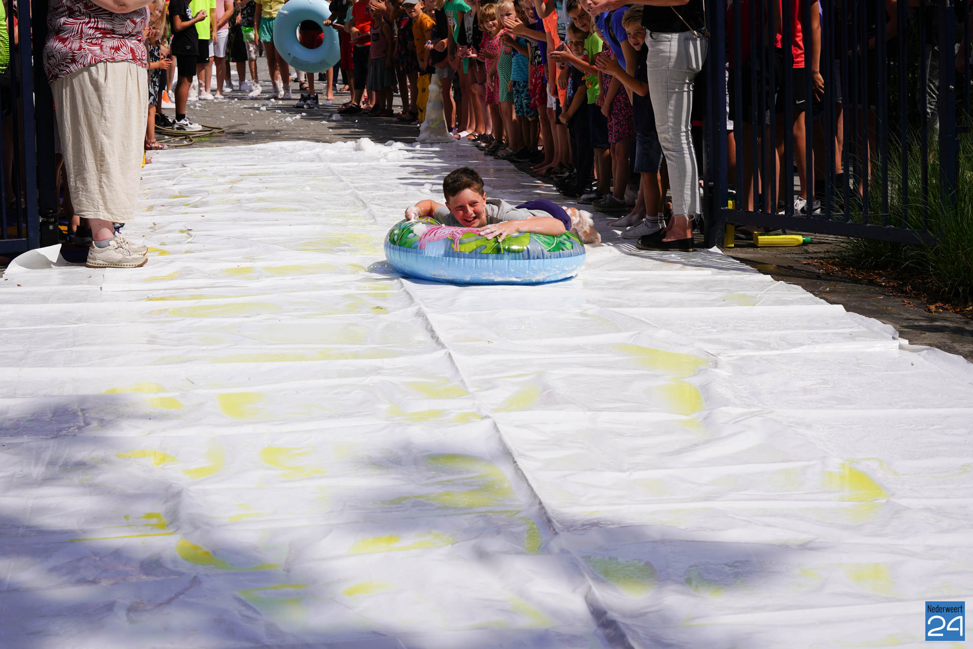Na het ontbijt werd er afscheid genomen van de juf waarna er nog een spel gespeeld werd. De dag werd afgesloten met een schuimparty en inmiddels, volgens traditie, het uitglijden van groep 8!