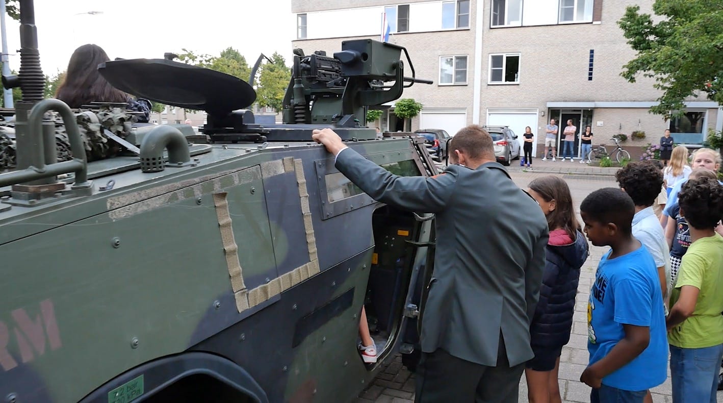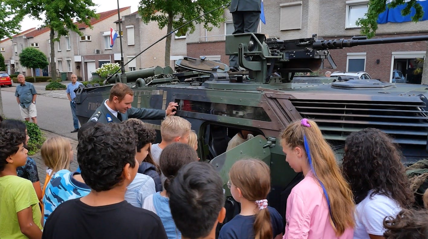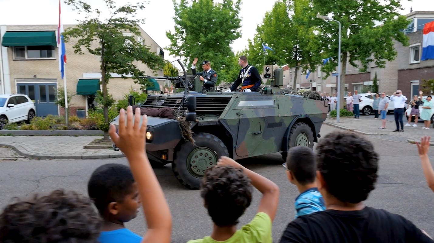 Sam werd eervol opgehaald door een militair voertuig genaamd de ‘Fennek’. Bewoners van de Kammerstraat hingen feestelijk de vlag uit, en kwamen in grote getalen samen om dit bijzondere moment te aanschouwen en te vieren. Ook de groep 7 leerlingen van basisschool Markeent waren aanwezig. Als uitje op de laatste schooldag van het jaar mochten zij een kijkje nemen in de ‘Fennek’.