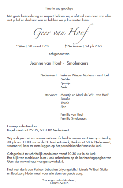 Overlijdensbericht: Geer van Hoef †